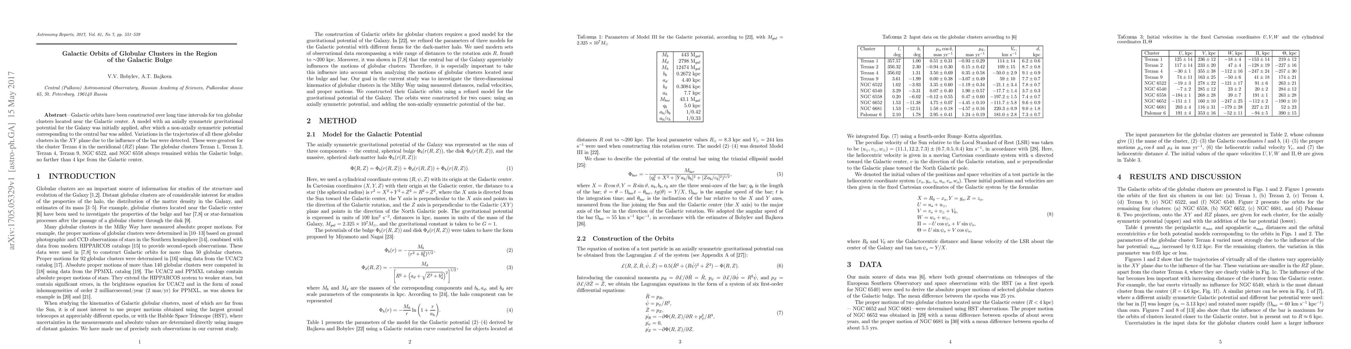 This study constructs long-term galactic orbits for ten globular clusters near the Galactic center, revealing significant trajectory variations due to the central bar's gravitational influence, with Terzan 4 showing the most pronounced changes. All clusters remain within 4 kpc of the Galactic center.