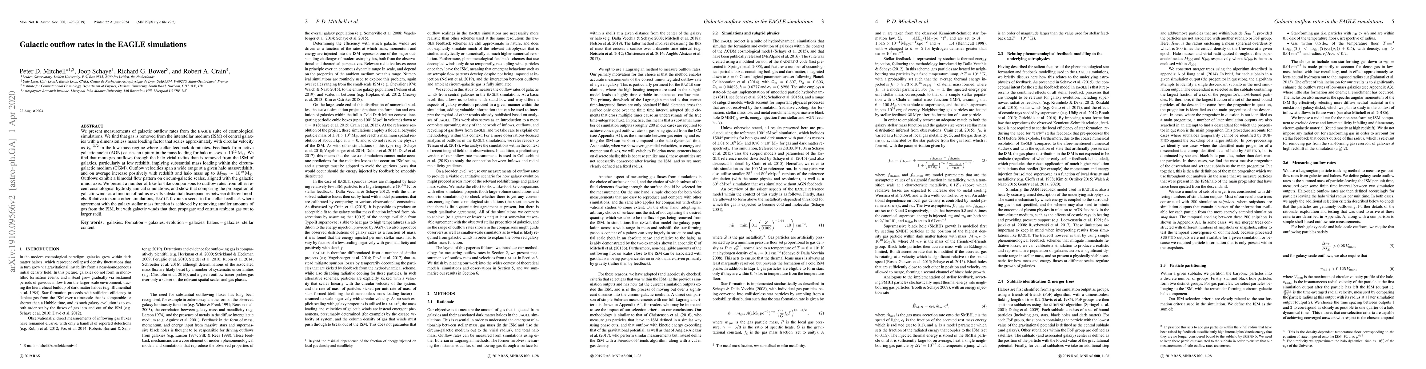 Galactic outflow rates in EAGLE simulations reveal that gas is removed from galaxy ISM with a rate scaling approximately with circular velocity, and more gas is outflowed than removed, with velocities increasing positively with redshift and halo mass.