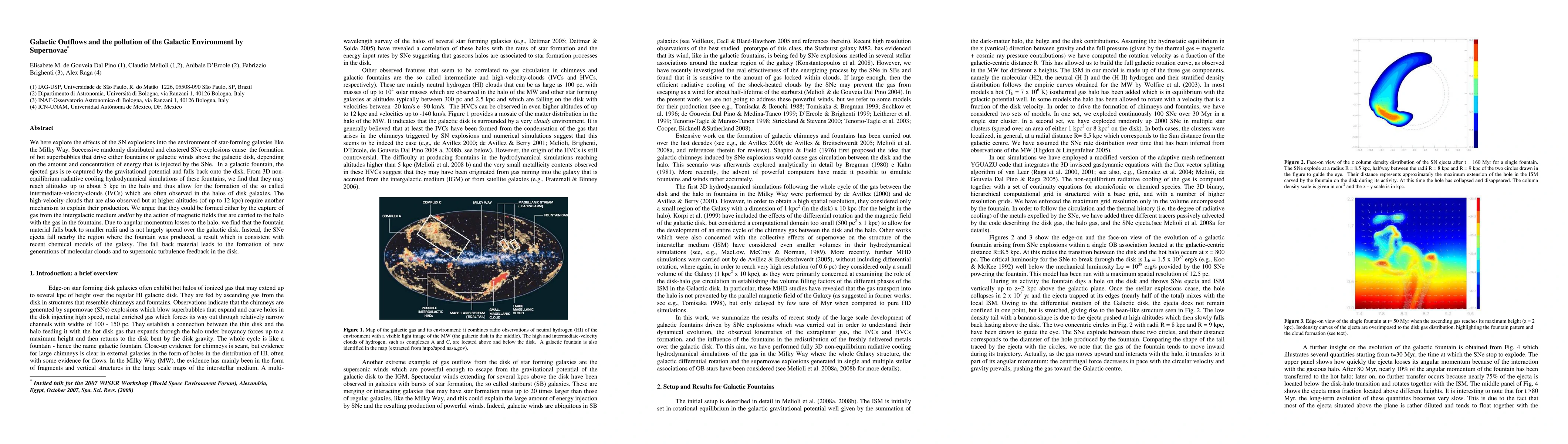 We here explore the effects of the SN explosions into the environment of star-forming galaxies like the Milky Way. Successive randomly distributed and clustered SNe explosions cause the formation of hot superbubbles that drive either fountains or galactic winds above the galactic disk, depending on the amount and concentration of energy that is injected by the SNe. In a galactic fountain, the ejected gas is re-captured by the gravitational potential and falls back onto the disk. From 3D nonequilibrium radiative cooling hydrodynamical simulations of these fountains, we find that they may reach altitudes up to about 5 kpc in the halo and thus allow for the formation of the so called intermediate-velocity-clouds (IVCs) which are often observed in the halos of disk galaxies. The high-velocity-clouds that are also observed but at higher altitudes (of up to 12 kpc) require another mechanism to explain their production. We argue that they could be formed either by the capture of gas from the intergalactic medium and/or by the action of magnetic fields that are carried to the halo with the gas in the fountains. Due to angular momentum losses to the halo, we find that the fountain material falls back to smaller radii and is not largely spread over the galactic disk. Instead, the SNe ejecta fall nearby the region where the fountain was produced, a result which is consistent with recent chemical models of the galaxy. The fall back material leads to the formation of new generations of molecular clouds and to supersonic turbulence feedback in the disk.