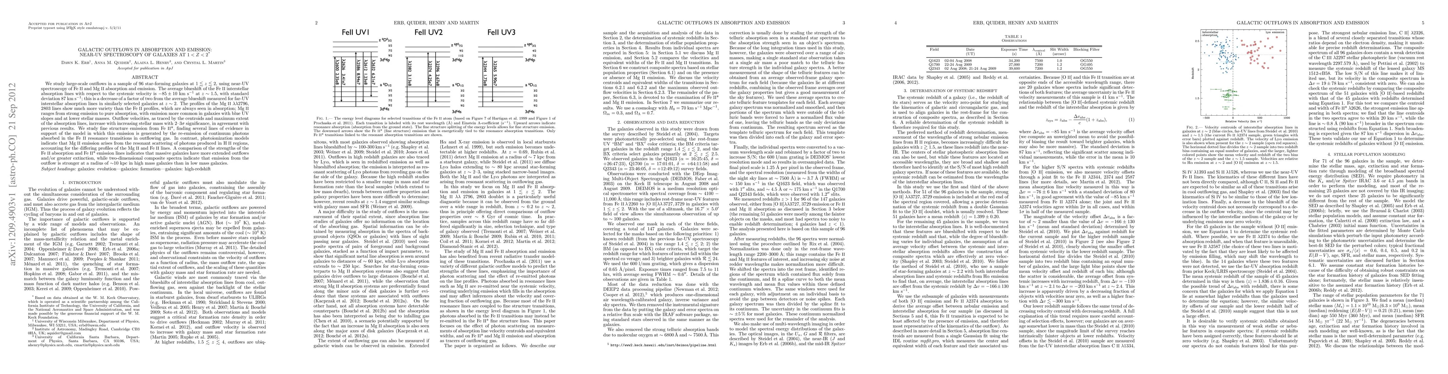 This study investigates large-scale outflows in 96 star-forming galaxies at 1<z<2 using near-UV spectroscopy, revealing that FeII absorption lines have an average blueshift of -85 km/s at z~1.5, while MgII profiles show more variability. The research supports models where FeII* emission is due to continuum photon re-emission in outflowing gas, contrasting with MgII emission from HII regions.