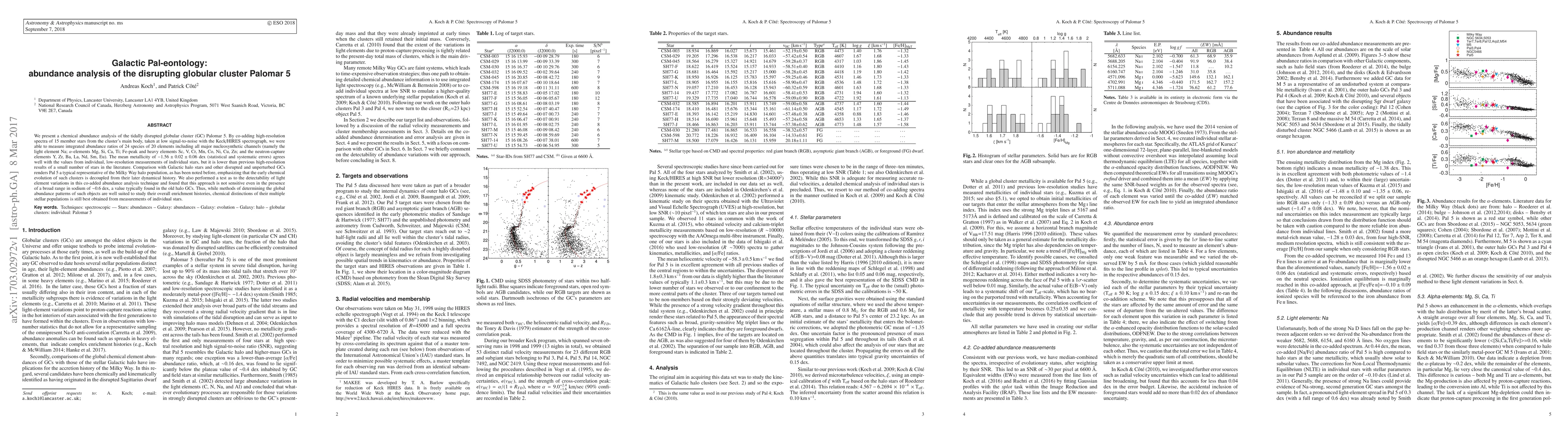 Researchers analyzed the chemical composition of Palomar 5, a tidally disrupted globular cluster, finding that its metallicity is consistent with the Milky Way halo population. The study highlights the importance of measuring individual stars for studying the multiple stellar populations within such clusters.