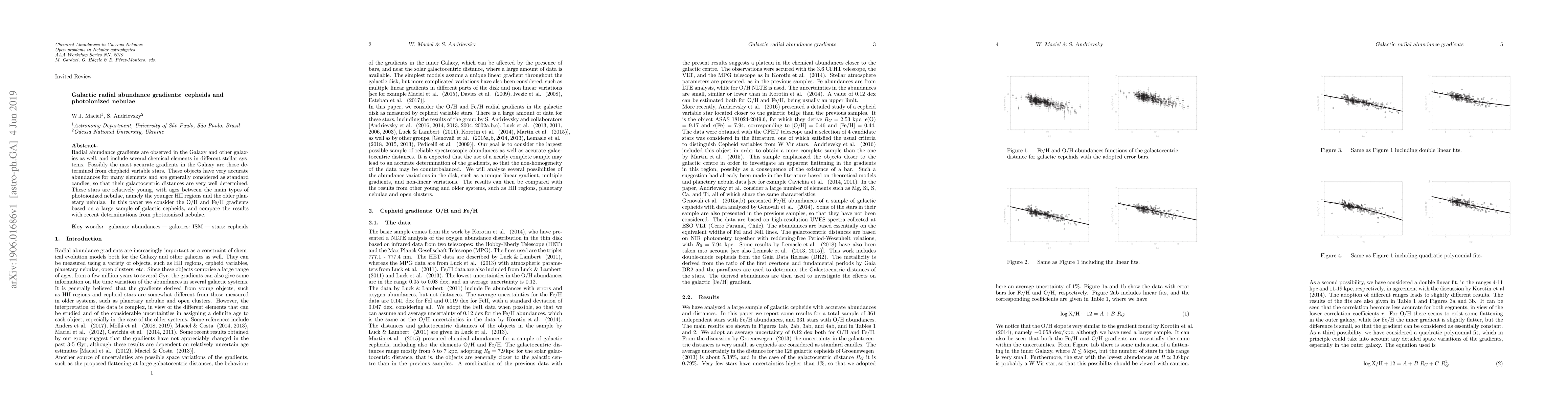 Radial abundance gradients are observed in the Galaxy and other galaxies as well, and include several chemical elements in different stellar systems. Possibly the most accurate gradients in the Galaxy are those determined from chepheid variable stars. These objects have very accurate abundances for many elements and are generally considered as standard candles, so that their galactocentric distances are very well determined. These stars are relatively young, with ages between the main types of photoionized nebulae, namely the younger HII regions and the older planetary nebulae. In this paper we consider the O/H and Fe/H gradients based on a large sample of galactic cepheids, and compare the results with recent determinations from photoionized nebulae.
