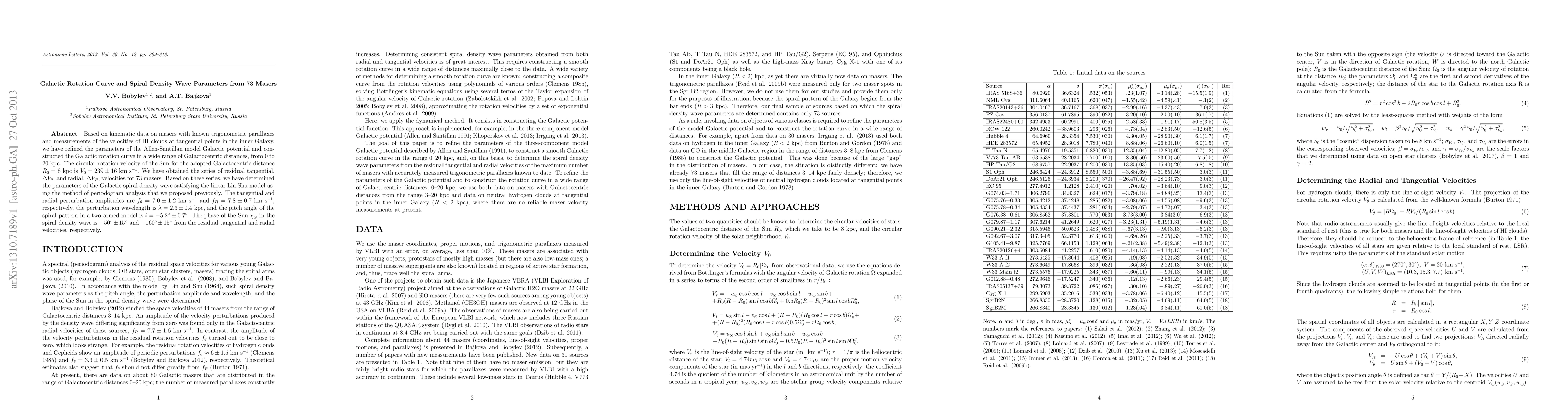 Based on kinematic data on masers with known trigonometric parallaxes and measurements of the velocities of HI clouds at tangential points in the inner Galaxy, we have refined the parameters of the Allen-Santillan model Galactic potential and constructed the Galactic rotation curve in a wide range of Galactocentric distances, from 0 to 20 kpc. The circular rotation velocity of the Sun for the adopted Galactocentric distance $R_0=8$ kpc is $V_0=239\pm16$ km s$^{-1}$. We have obtained the series of residual tangential, $\Delta V_{\theta}$, and radial, $\Delta V_R,$ velocities for 73 masers. Based on these series, we have determined the parameters of the Galactic spiral density wave satisfying the linear Lin.Shu model using the method of periodogram analysis that we proposed previously. The tangential and radial perturbation amplitudes are $f_\theta=7.0\pm1.2$ km s$^{-1}$ and $f_R=7.8\pm0.7$ km s$^{-1}$, respectively, the perturbation wavelength is $\lambda=2.3\pm0.4$ kpc, and the pitch angle of the spiral pattern in a two-armed model is $i=-5.2^\circ\pm0.7^\circ$. The phase of the Sun $\chi_\odot$ in the spiral density wave is $-50^\circ\pm15^\circ$ and $-160^\circ\pm15^\circ$ from the residual tangential and radial velocities, respectively.