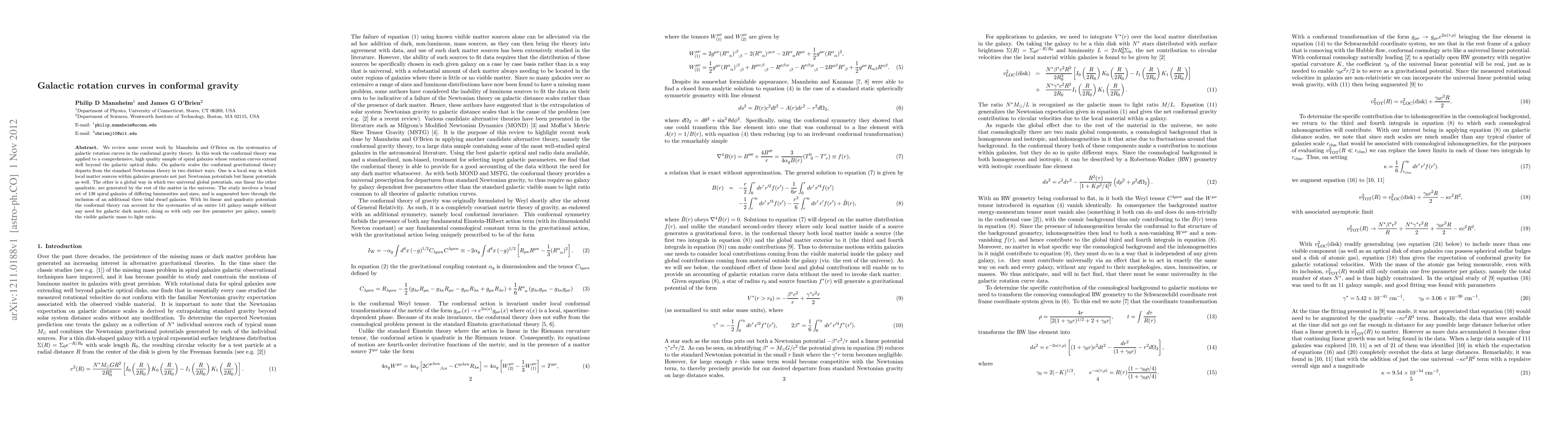 We review some recent work by Mannheim and O'Brien on the systematics of galactic rotation curves in the conformal gravity theory. In this work the conformal theory was applied to a comprehensive, high quality sample of spiral galaxies whose rotation curves extend well beyond the galactic optical disks. On galactic scales the conformal gravitational theory departs from the standard Newtonian theory in two distinct ways. One is a local way in which local matter sources within galaxies generate not just Newtonian potentials but linear potentials as well. The other is a global way in which two universal global potentials, one linear the other quadratic, are generated by the rest of the matter in the universe. The study involves a broad set of 138 spiral galaxies of differing luminosities and sizes, and is augmented here through the inclusion of an additional three tidal dwarf galaxies. With its linear and quadratic potentials the conformal theory can account for the systematics of an entire 141 galaxy sample without any need for galactic dark matter, doing so with only one free parameter per galaxy, namely the visible galactic mass to light ratio.