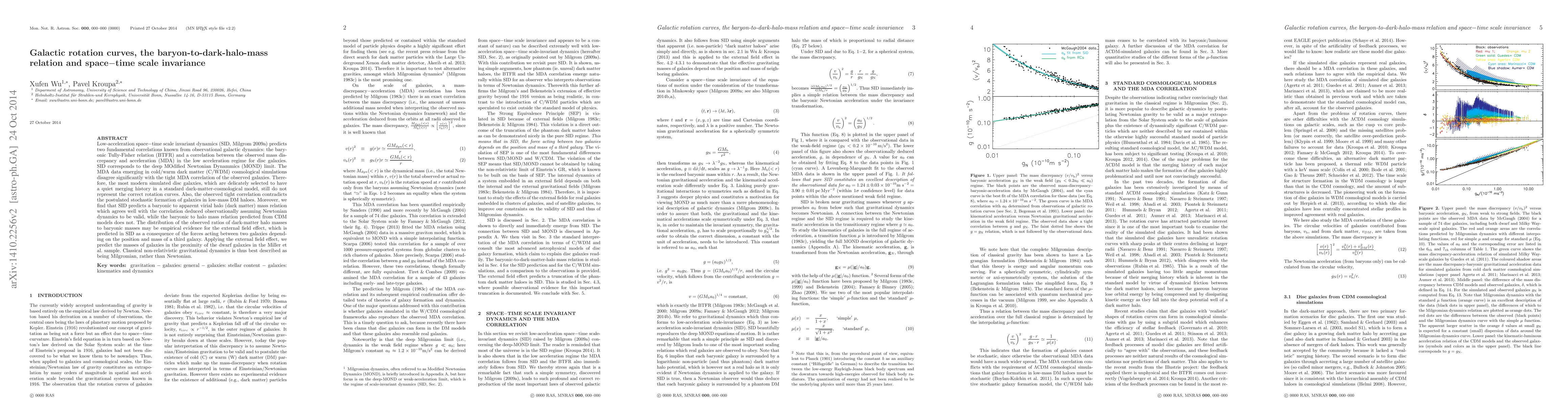 Low-acceleration space-time scale invariant dynamics (SID, Milgrom 2009a) predicts two fundamental correlations known from observational galactic dynamics: the baryonic Tully-Fisher relation (BTFR) and a correlation between the observed mass discrepancy and acceleration (MDA) in the low acceleration regime for disc galaxies. SID corresponds to the deep MOdified Newtonian Dynamics (MOND) limit. The MDA data emerging in cold/warm dark matter (C/WDM) cosmological simulations disagree significantly with the tight MDA correlation of the observed galaxies. Therefore, the most modern simulated disc galaxies, which are delicately selected to have a quiet merging history in a standard dark-matter-cosmological model, still do not represent the correct rotation curves. Also, the observed tight correlation contradicts the postulated stochastic formation of galaxies in low-mass DM halos. Moreover, we find that SID predicts a baryonic to apparent virial halo (dark matter) mass relation which agrees well with the correlation deduced observationally assuming Newtonian dynamics to be valid, while the baryonic to halo mass relation predicted from CDM models does not. The distribution of the observed ratios of dark-matter halo masses to baryonic masses may be empirical evidence for the external field effect, which is predicted in SID as a consequence of the forces acting between two galaxies depending on the position and mass of a third galaxy. Applying the external field effect, we predict the masses of galaxies in the proximity of the dwarf galaxies in the Miller et al. sample. Classical non-relativistic gravitational dynamics is thus best described as being Milgromian, rather than Newtonian.
