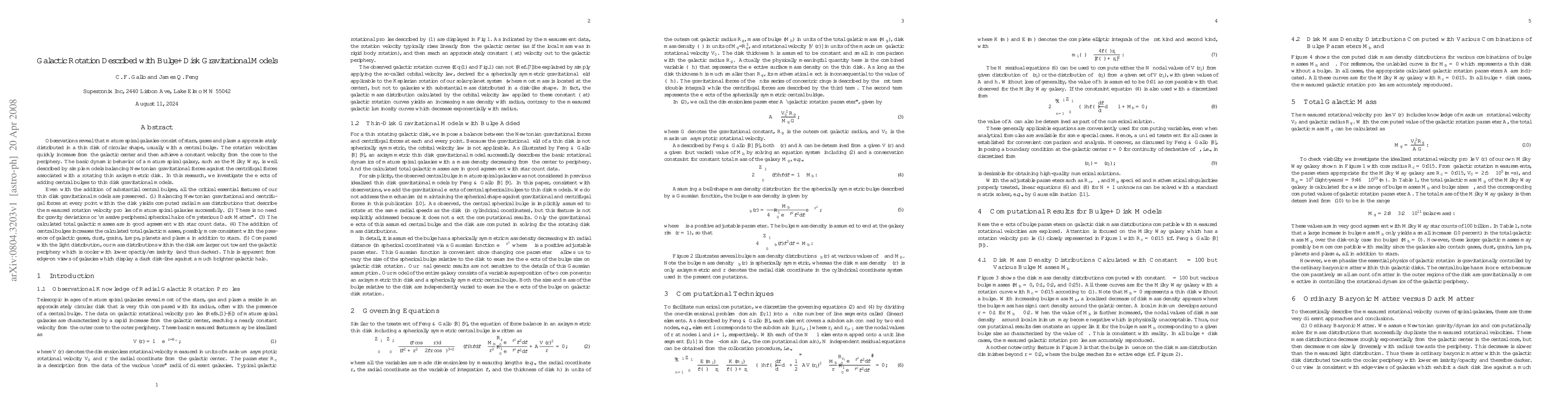 Observations reveal that mature spiral galaxies consist of stars, gases and plasma approximately distributed in a thin disk of circular shape, usually with a central bulge. The rotation velocities quickly increase from the galactic center and then achieve a constant velocity from the core to the periphery. The basic dynamic behavior of a mature spiral galaxy, such as the Milky Way, is well described by simple models balancing Newtonian gravitational forces against the centrifugal forces associated with a rotating thin axisymmetric disk. In this research, we investigate the effects of adding central bulges to thin disk gravitational models. Even with the addition of substantial central bulges, all the critical essential features of our thin disk gravitational models are preserved. (1) Balancing Newtonian gravitational and centrifugal forces at every point within the disk yields computed radial mass distributions that describe the measured rotation velocity profiles of mature spiral galaxies successfully. (2) There is no need for gravity deviations or ``massive peripheral spherical halos of mysterious Dark Matter''. (3) The calculated total galactic masses are in good agreement with star count data. (4) The addition of central bulges increases the calculated total galactic masses, possibly more consistent with the presence of galactic gases, dust, grains, lumps, planets and plasma in addition to stars. (5) Compared with the light distribution, our mass distributions within the disk are larger out toward the galactic periphery which is cooler with lower opactiy/emissivity (and thus darker). This is apparent from edge-on views of galaxies which display a dark disk-line against a much brighter galactic halo.