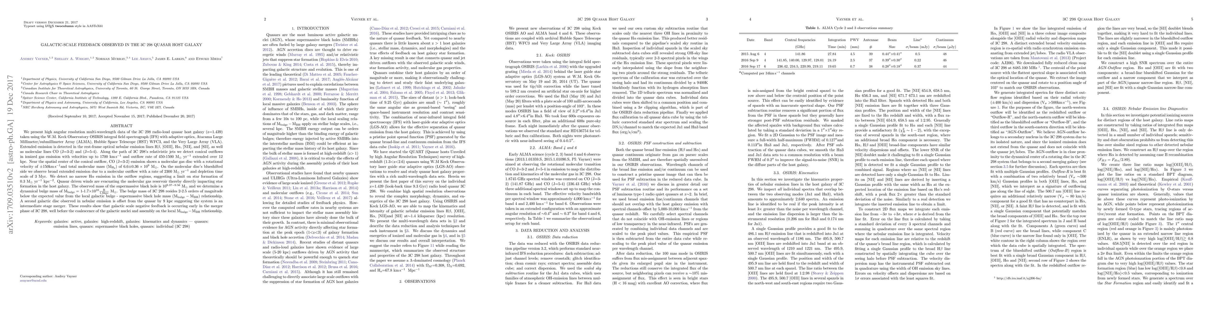 We present high angular resolution multi-wavelength data of the 3C 298 radio-loud quasar host galaxy (z=1.439) taken using the W.M. Keck Observatory OSIRIS integral field spectrograph with adaptive optics, Atacama Large Millimeter/submillimeter Array (ALMA), Hubble Space Telescope (HST) WFC3, and the Very Large Array (VLA). Extended emission is detected in the rest-frame optical nebular emission lines H$\beta$, [OIII], H$\alpha$, [NII], and [SII], as well as molecular lines CO (J=3-2) and (J=5-4). Along the path of 3C 298's relativistic jets we detect conical outflows of ionized gas with velocities up to 1700 km s$^{-1}$ and outflow rate of 450-1500 M$_\odot$yr$^{-1}$. Near the spatial center of the conical outflow, CO (J=3-2) emission shows a molecular gas disc with a total molecular mass ($\rm M_{H_{2}}$) of 6.6$\pm0.36\times10^{9}$M$_{\odot}$. On the molecular disc's blueshifted side we observe a molecular outflow with a rate of 2300 M$_\odot$yr$^{-1}$ and depletion time scale of 3 Myr. We detect no narrow H$\alpha$ emission in the outflow regions, suggesting a limit on star formation of 0.3 M$_\odot$yr$^{-1}$kpc$^{-2}$. Quasar driven winds are evacuating the molecular gas reservoir thereby directly impacting star formation in the host galaxy. The observed mass of the supermassive black hole is $10^{9.37-9.56}$M$_{\odot}$ and we determine a dynamical bulge mass of 1-1.7$\rm\times10^{10}\frac{R}{1.6 kpc}$ M$_{\odot}$. The bulge mass of 3C 298 resides 2-2.5 orders of magnitude below the expected value from the local M$\rm_{bulge}-M_{BH}$ relationship. A second galactic disc observed in nebular emission is offset from the quasar by 9 kpc suggesting the system is an intermediate stage merger. These results show that galactic scale negative feedback is occurring early in the merger phase of 3C 298, well before the coalescence of the galactic nuclei and assembly on the local relationship.