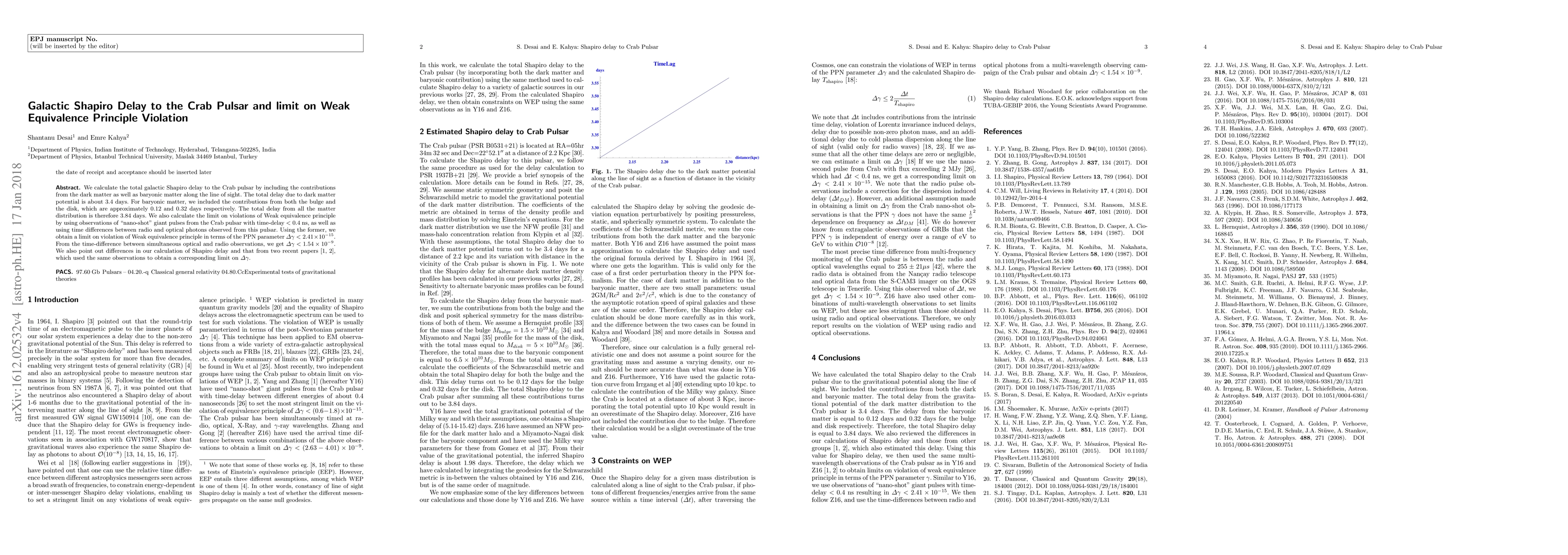 This paper calculates the total galactic Shapiro delay to the Crab pulsar, including contributions from both dark and baryonic matter, resulting in a total delay of 3.84 days. It also sets limits on violations of Einstein's equivalence principle, obtaining $\Delta \gamma < 2.41\times 10^{-15}$ from "nano-shot" giant pulses and $\Delta \gamma < 1.54\times 10^{-9}$ from optical-radio time differences.
