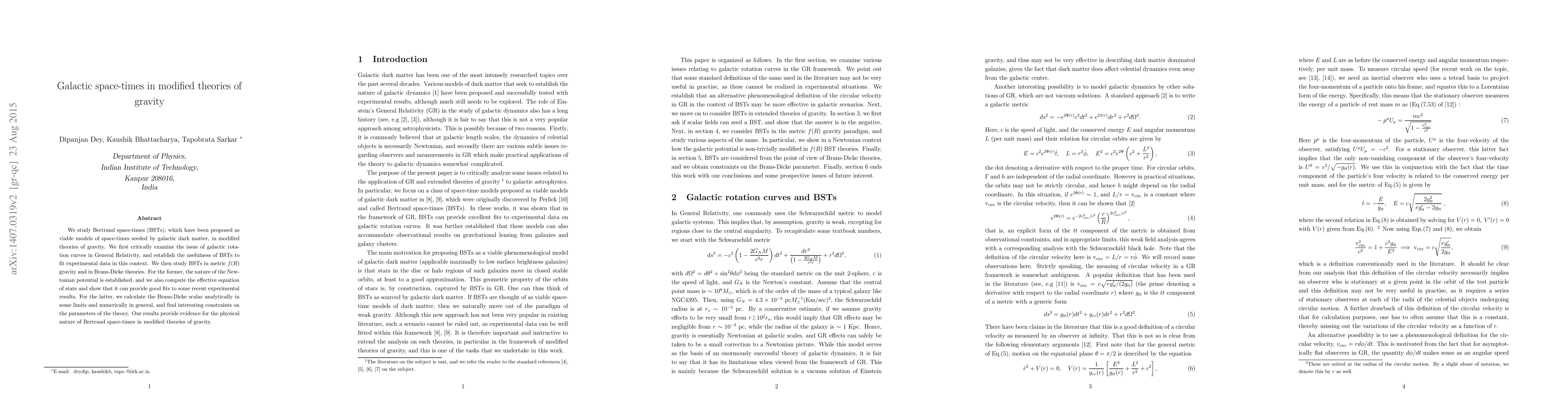 We study Bertrand space-times (BSTs), which have been proposed as viable models of space-times seeded by galactic dark matter, in modified theories of gravity. We first critically examine the issue of galactic rotation curves in General Relativity, and establish the usefulness of BSTs to fit experimental data in this context. We then study BSTs in metric $f(R)$ gravity and in Brans-Dicke theories. For the former, the nature of the Newtonian potential is established, and we also compute the effective equation of state and show that it can provide good fits to some recent experimental results. For the latter, we calculate the Brans-Dicke scalar analytically in some limits and numerically in general, and find interesting constraints on the parameters of the theory. Our results provide evidence for the physical nature of Bertrand space-times in modified theories of gravity.