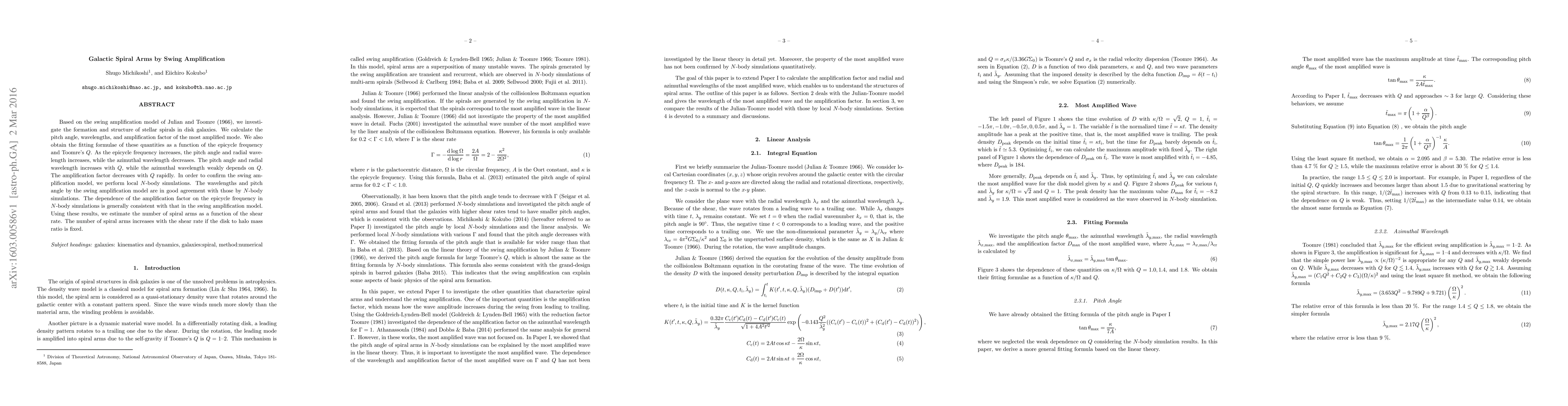 This paper explores the formation and structure of stellar spirals in disk galaxies using the swing amplification model, finding that pitch angle and radial wavelength increase with epicycle frequency and Toomre's $Q$, while the amplification factor decreases rapidly with $Q$. Local $N$-body simulations confirm these results, leading to an estimate of spiral arm numbers increasing with shear rate.