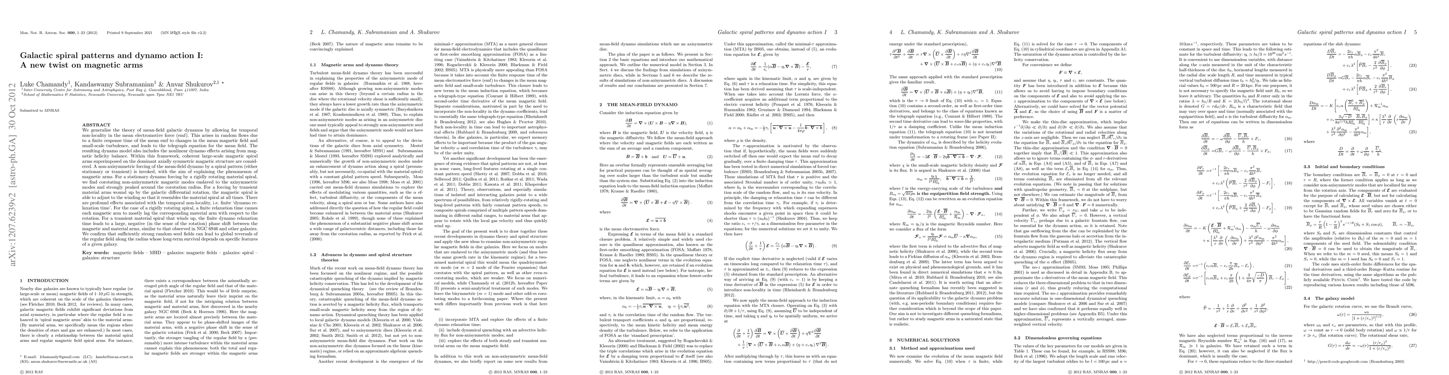 This paper generalizes mean-field galactic dynamo theory to include temporal non-locality, explaining the formation of magnetic spiral arms through non-axisymmetric dynamo effects. The study finds that a finite dynamo relaxation time leads to phase shifts between magnetic and material spiral arms, mirroring observations in galaxies like NGC 6946.