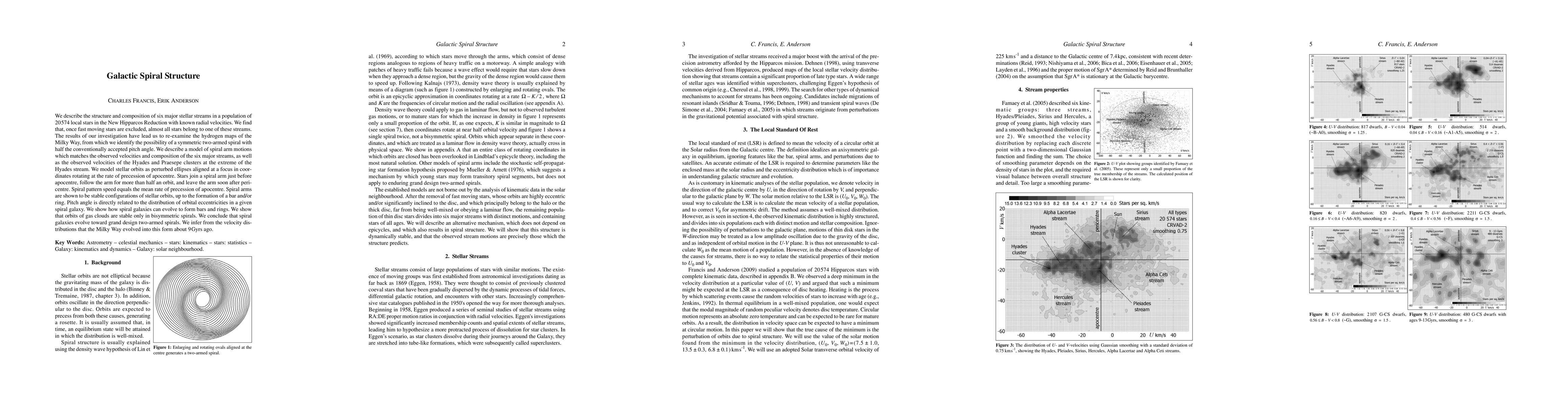 We describe the structure and composition of six major stellar streams in a population of 20 574 local stars in the New Hipparcos Reduction with known radial velocities. We find that, once fast moving stars are excluded, almost all stars belong to one of these streams. The results of our investigation have lead us to re-examine the hydrogen maps of the Milky Way, from which we identify the possibility of a symmetric two-armed spiral with half the conventionally accepted pitch angle. We describe a model of spiral arm motions which matches the observed velocities and composition of the six major streams, as well as the observed velocities of the Hyades and Praesepe clusters at the extreme of the Hyades stream. We model stellar orbits as perturbed ellipses aligned at a focus in coordinates rotating at the rate of precession of apocentre. Stars join a spiral arm just before apocentre, follow the arm for more than half an orbit, and leave the arm soon after pericentre. Spiral pattern speed equals the mean rate of precession of apocentre. Spiral arms are shown to be stable configurations of stellar orbits, up to the formation of a bar and/or ring. Pitch angle is directly related to the distribution of orbital eccentricities in a given spiral galaxy. We show how spiral galaxies can evolve to form bars and rings. We show that orbits of gas clouds are stable only in bisymmetric spirals. We conclude that spiral galaxies evolve toward grand design two-armed spirals. We infer from the velocity distributions that the Milky Way evolved into this form about 9 Gyrs ago.