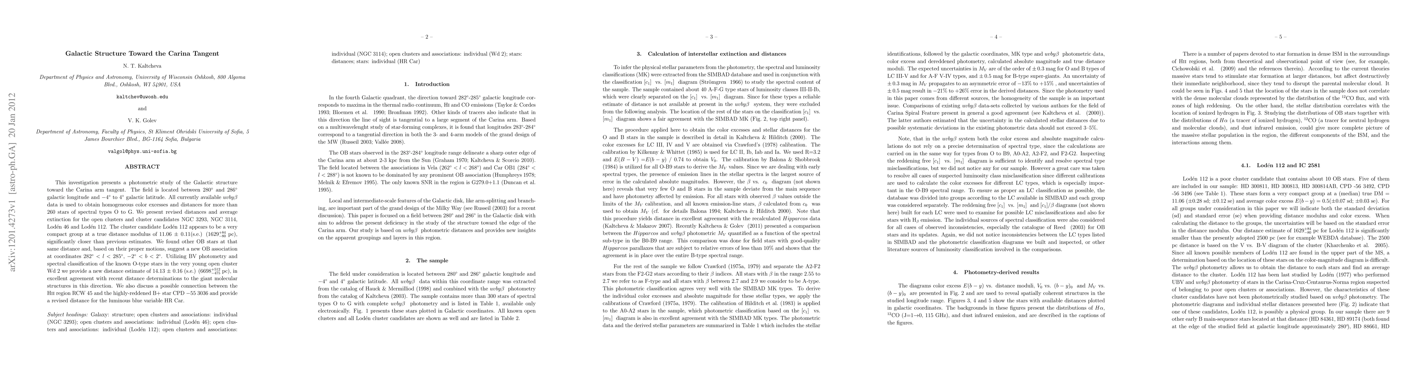 This investigation presents a photometric study of the Galactic structure toward the Carina arm tangent. The field is located between 280 deg and 286 deg galactic longitude and -4 deg to 4 deg galactic latitude. All currently available uvbybeta data is used to obtain homogeneous color excesses and distances for more than 260 stars of spectral types O to G. We present revised distances and average extinction for the open clusters and cluster candidates NGC 3293, NGC 3114, Loden 46 and Loden 112. The cluster candidate Loden 112 appears to be a very compact group at a true distance modulus of 11.06 +\- 0.11 (s.e.) (1629 +84,-80 pc), significantly closer than previous estimates. We found other OB stars at that same distance and, based on their proper motions, suggest a new OB association at coordinates 282 deg < l < 285 deg, -2 deg < b < 2 deg. Utilizing BV photometry and spectral classification of the known O-type stars in the very young open cluster Wd 2 we provide a new distance estimate of 14.13 +\-0.16 (s.e.) (6698 +512,-475 pc), in excellent agreement with recent distance determinations to the giant molecular structures in this direction. We also discuss a possible connection between the HII region RCW 45 and the highly-reddened B+ star CPD -55 3036 and provide a revised distance for the luminous blue variable HR Car.