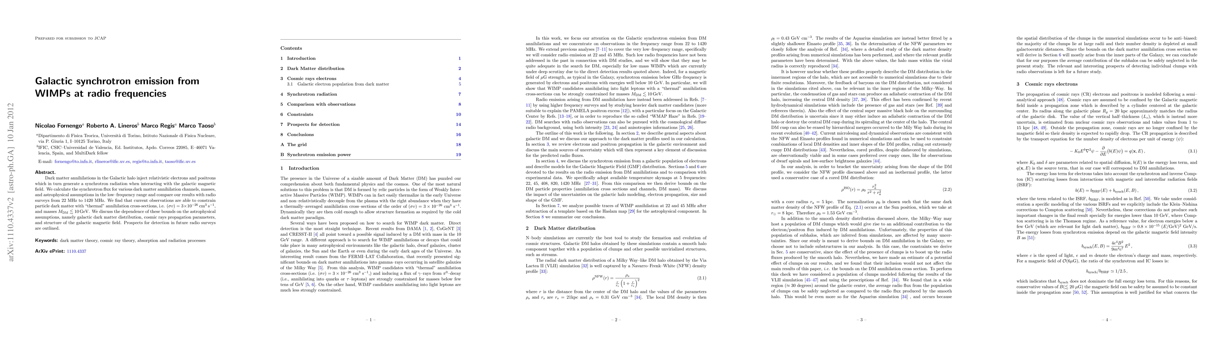 This paper investigates the synchrotron radiation generated by dark matter annihilations in the Galactic halo, comparing calculated low-frequency synchrotron flux with current radio observations. The study finds that current radio surveys can constrain dark matter with thermal annihilation cross-sections and masses below 10 GeV, highlighting the influence of astrophysical assumptions on these constraints.