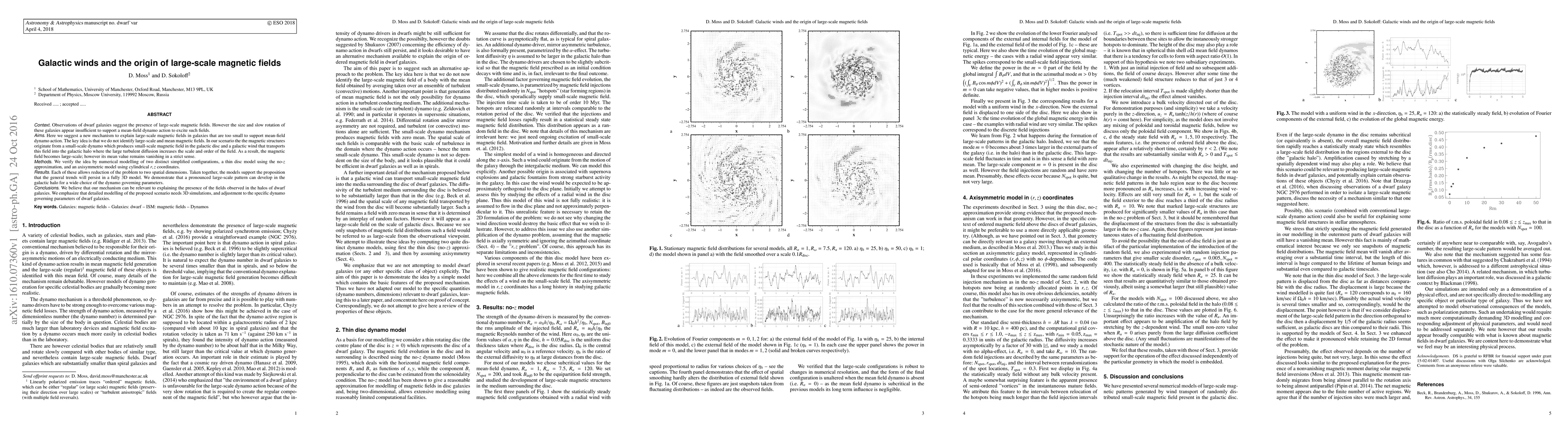 This paper proposes a new mechanism for generating large-scale magnetic fields in dwarf galaxies, suggesting that small-scale magnetic fields produced by a galactic wind and enhanced by turbulent diffusion in the galactic halo can create large-scale fields despite insufficient conditions for mean-field dynamo action. Numerical simulations support this idea and indicate its potential relevance for observed magnetic fields in dwarf galaxies.