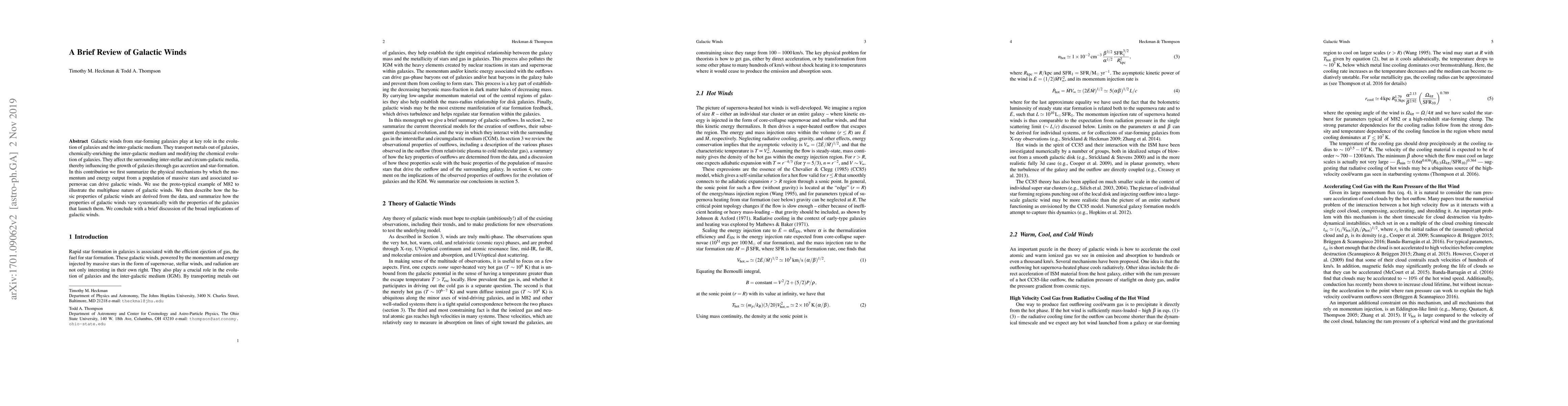 Galactic winds from star-forming galaxies play at key role in the evolution of galaxies and the inter-galactic medium. They transport metals out of galaxies, chemically-enriching the inter-galactic medium and modifying the chemical evolution of galaxies. They affect the surrounding inter-stellar and circum-galactic media, thereby influencing the growth of galaxies through gas accretion and star-formation. In this contribution we first summarize the physical mechanisms by which the momentum and energy output from a population of massive stars and associated supernovae can drive galactic winds. We use the proto-typical example of M82 to illustrate the multiphase nature of galactic winds. We then describe how the basic properties of galactic winds are derived from the data, and summarize how the properties of galactic winds vary systematically with the properties of the galaxies that launch them. We conclude with a brief discussion of the broad implications of galactic winds.