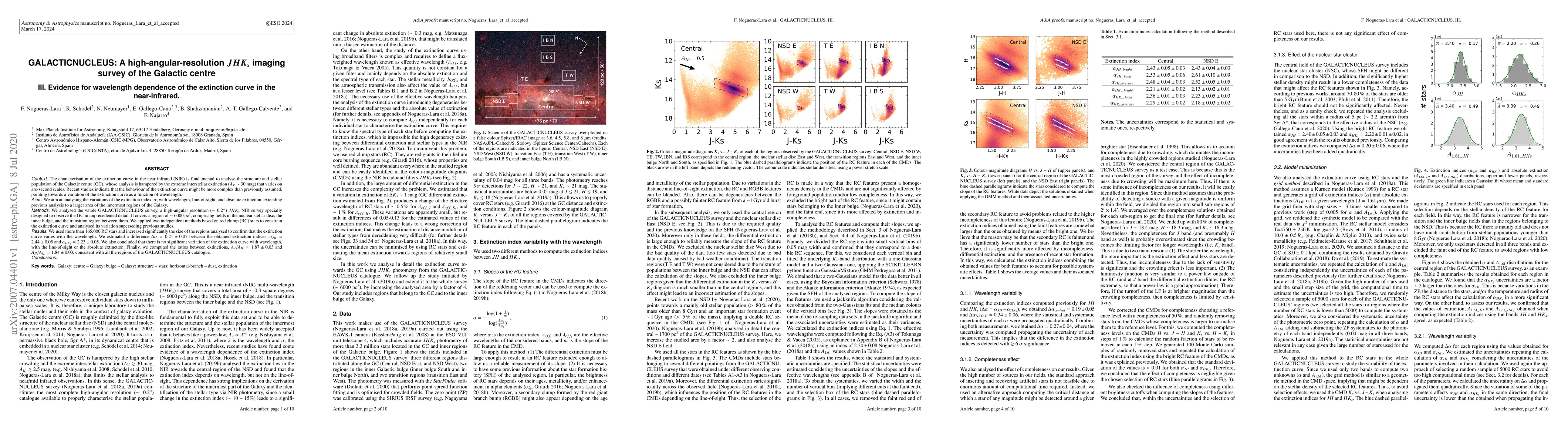 The characterisation of the extinction curve in the near infrared (NIR) is fundamental to analyse the structure and stellar population of the Galactic centre (GC), whose analysis is hampered by the extreme interstellar extinction ($A_V\sim 30$ mag) that varies on arc-second scales. Recent studies indicate that the behaviour of the extinction curve might be more complex than previously assumed, pointing towards a variation of the extinction curve as a function of wavelength. We aim at analysing the variations of the extinction index, $\alpha$, with wavelength, line-of-sight, and absolute extinction, extending previous analysis to a larger area of the innermost regions of the Galaxy. We analysed the whole GALACTICNUCLEUS survey, a high-angular resolution ($\sim 0.2''$) $JHK_s$ NIR survey specially designed to observe the GC in unprecedented detail. It covers a region of $\sim 6000$\,pc$^2$, comprising fields in the nuclear stellar disc, the inner bulge, and the transition region between them. We applied two independent methods based on red clump (RC) stars to constrain the extinction curve and analysed its variation superseding previous studies. We used more than 165,000 RC stars and increased significantly the size of the regions analysed to confirm that the extinction curve varies with the wavelength. We estimated a difference $\Delta\alpha = 0.21\pm0.07$ between the obtained extinction indices, $\alpha_{JH}=2.44\pm0.05$ and $\alpha_{HK_s} = 2.23\pm0.05$. We also concluded that there is no significant variation of the extinction curve with wavelength, with the line-of-sight or the absolute extinction. Finally, we computed the ratios between extinctions, $A_J/A_H = 1.87\pm0.03$ and $A_{H}/A_{K_s} = 1.84\pm0.03$, consistent with all the regions of the GALACTICNUCLEUS catalogue.