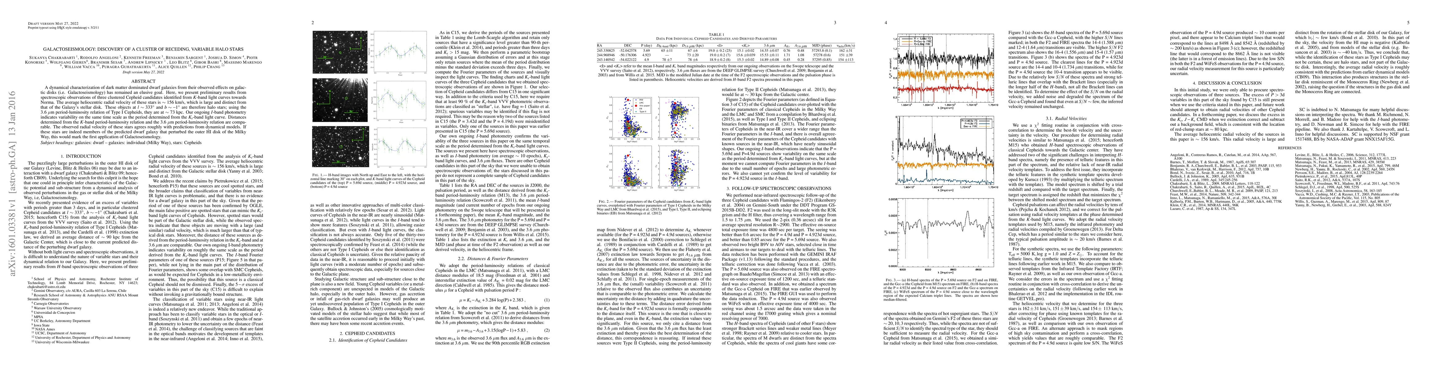 A dynamical characterization of dark matter dominated dwarf galaxies from their observed effects on galactic disks (i.e. Galactoseismology) has remained an elusive goal. Here, we present preliminary results from spectroscopic observations of three clustered Cepheid candidates identified from $K$-band light curves towards Norma. The average heliocentric radial velocity of these stars is $\sim$ 156 km/s, which is large and distinct from that of the Galaxy's stellar disk. These objects at $l \sim 333 ^\circ$ and $b \sim -1 ^\circ$ are therefore halo stars; using the $3.6~\micron$ period-luminosity relation of Type I Cepheids, they are at $\sim$ 73 kpc. Our ongoing $I$-band photometry indicates variability on the same time scale as the period determined from the $K_{s}$-band light curve. Distances determined from the $K$-band period-luminosity relation and the 3.6 $\micron$ period-luminosity relation are comparable. The observed radial velocity of these stars agrees roughly with predictions from dynamical models. If these stars are indeed members of the predicted dwarf galaxy that perturbed the outer HI disk of the Milky Way, this would mark the first application of Galactoseismology.