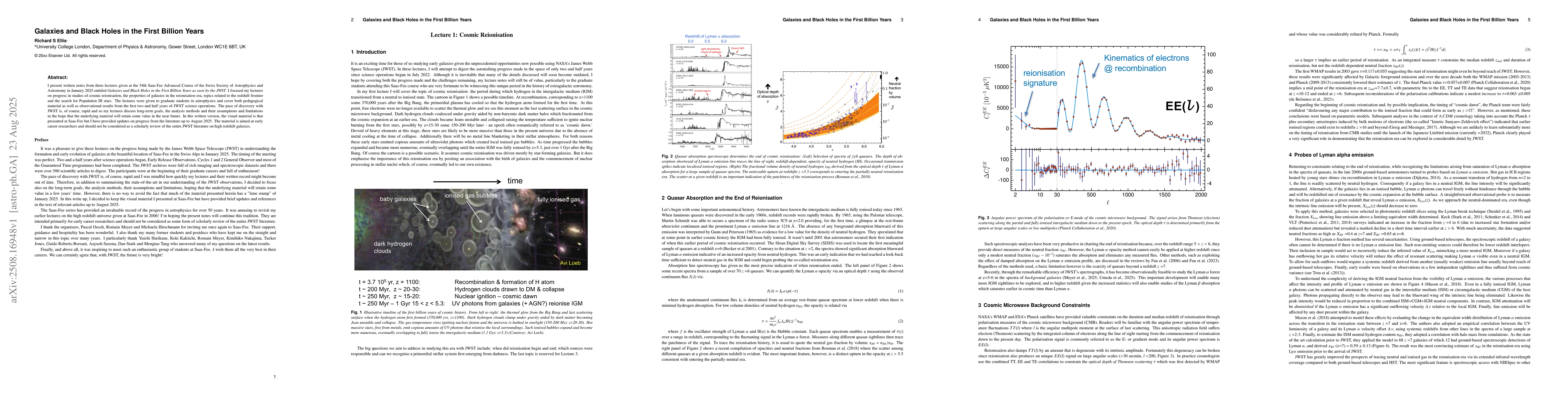I present written notes from three lectures given at the 54th Saas-Fee Advanced Course of the Swiss Society of Astrophysics and Astronomy in January 2025 entitled "Galaxies and Black Holes in the First Billion Years as seen by the JWST". I focused my lectures on progress in studies of cosmic reionisation, the properties of galaxies in the reionisation era, topics related to the redshift frontier and the search for Population III stars. The lectures were given to graduate students in astrophysics and cover both pedagogical material as well as observational results from the first two and half years of JWST science operations. The pace of discovery with JWST is, of course, rapid and so my lectures discuss long-term goals, analysis methods and their assumptions and limitations in the hope that the underlying material will retain value in the near future. In this written version, the visual material is that presented at Saas-Fee in January 2025 but I have provided updates on progress from the literature up to August 2025. The material is aimed at early career researchers and should not be considered as a scholarly review of the entire JWST literature on high redshift galaxies