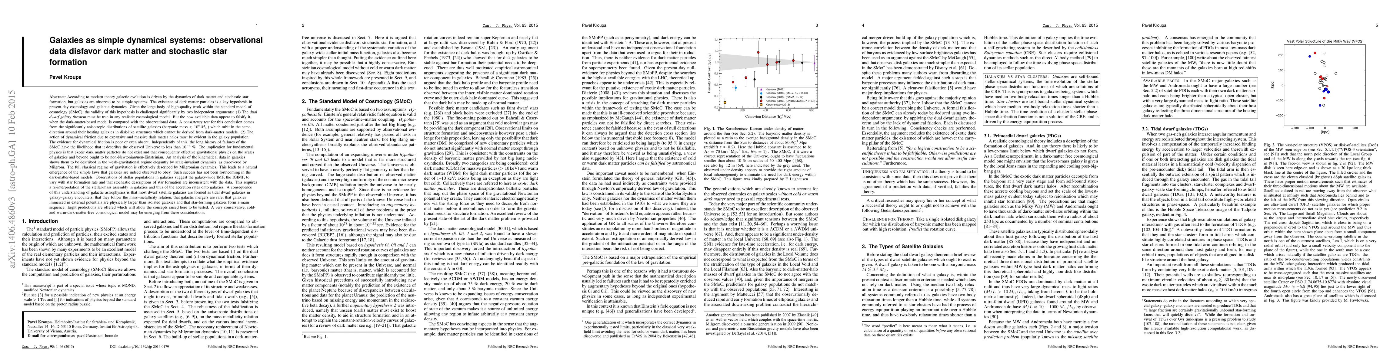 (Abridged) Galaxies are observed to be simple systems but the standard model of cosmology (SMoC) implies a haphazard merger history driven by dynamical friction on dark matter halos. The SMoC is tested here with the results that the dual dwarf galaxy theorem is in contradiction to the data if the SMoC is true, and the action of dynamical friction is not evident in the galaxy population. A consistency test for this conclusion comes from the significantly anisotropic distributions of satellite galaxies. Independently, the long history of failures of the SMoC have the likelihood that it describes the observed Universe to less than 10^-4 per cent. The implication for fundamental physics is that exotic dark matter particles do not exist and that consequently effective gravitational physics on the scales of galaxies and beyond ought to be non-Newtonian/non-Einsteinian. The data imply that scale-invariant dynamics, as discovered by Milgrom, is an excellent description of galaxies in the weak-field regime. Observations of stellar populations in galaxies suggest the galaxy-wide IMF, the IGIMF, to vary with star formation rate and that stochastic descriptions of star formation are inconsistent with the data. A consequence of this understanding of galactic astrophysics is that most dwarf satellite galaxies are formed as tidal dwarf galaxies in galaxy-galaxy encounters, that they follow the mass-metallicity relation, that galactic mergers are rare, that galaxies immersed in external potentials are physically larger than isolated galaxies and that star-forming galaxies form a main sequence. Eight predictions are offered which will allow the concepts raised here to be tested. A very conservative, cold- and warm-dark-matter-free cosmological model may be emerging from these considerations.