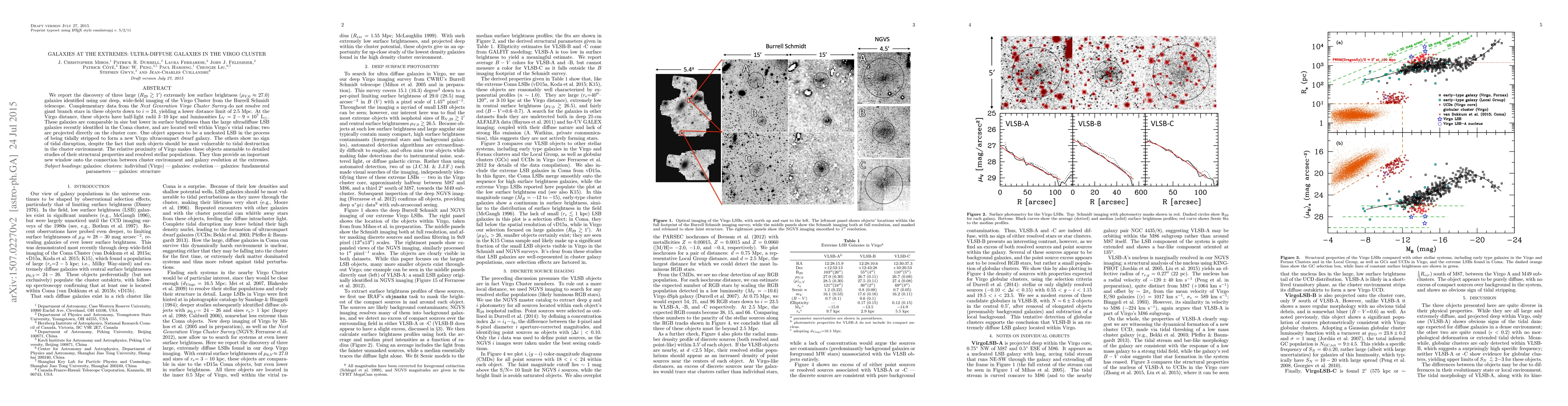 This paper reports the discovery of three ultra-diffuse, low surface brightness galaxies in the Virgo Cluster, characterized by large sizes and faint luminosities. These galaxies, located within Virgo's virial radius, challenge expectations of tidal disruption, offering a new perspective on the relationship between cluster environments and galaxy evolution.