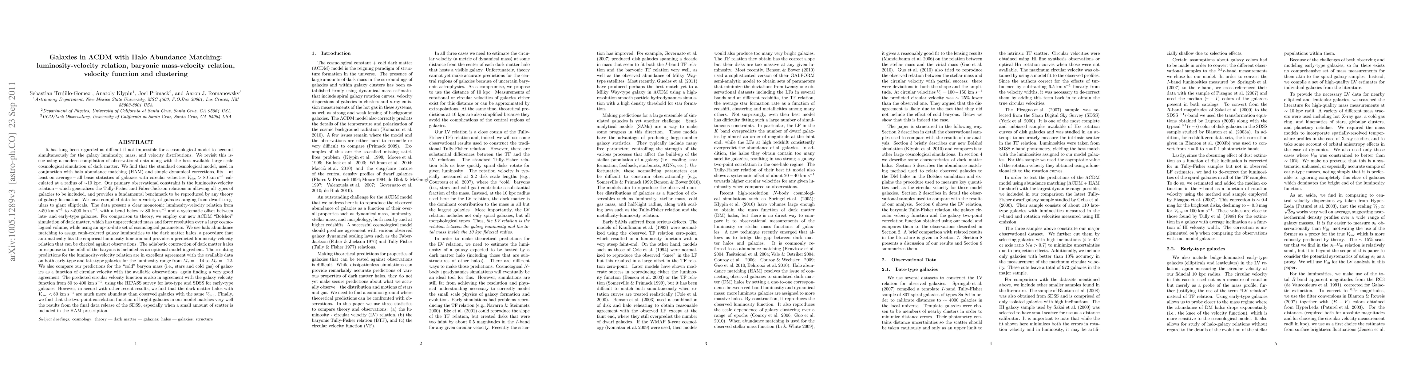 This paper investigates the ability of the standard cosmological model (LCDM) to match observational data on galaxy luminosity, mass, and velocity using halo abundance matching (HAM). The study shows that the model fits the luminosity-velocity relation and baryonic mass-velocity relation well for galaxies with circular velocities above 80 km/s, but struggles to match the abundance of low-velocity galaxies.