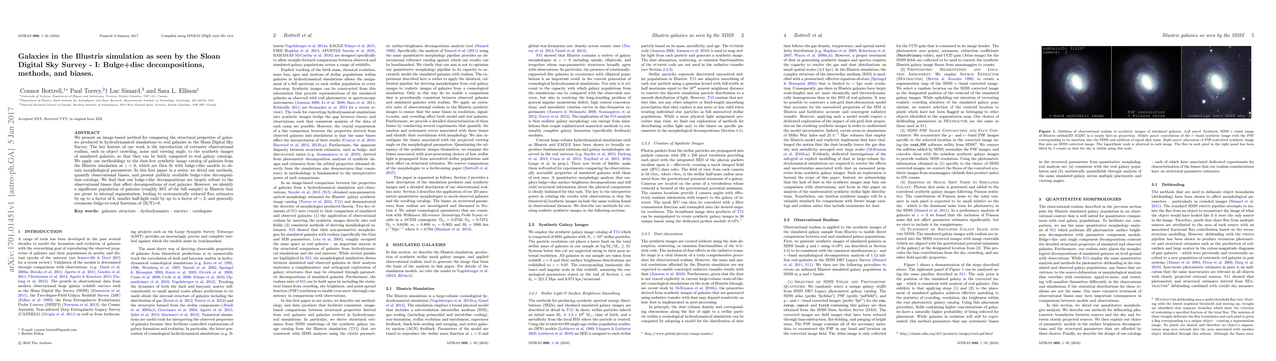 We present an image-based method for comparing the structural properties of galaxies produced in hydrodynamical simulations to real galaxies in the Sloan Digital Sky Survey. The key feature of our work is the introduction of extensive observational realism, such as object crowding, noise and viewing angle, to the synthetic images of simulated galaxies, so that they can be fairly compared to real galaxy catalogs. We apply our methodology to the dust-free synthetic image catalog of galaxies from the Illustris simulation at $z=0$, which are then fit with bulge+disc models to obtain morphological parameters. In this first paper in a series, we detail our methods, quantify observational biases, and present publicly available bulge+disc decomposition catalogs. We find that our bulge+disc decompositions are largely robust to the observational biases that affect decompositions of real galaxies. However, we identify a significant population of galaxies (roughly 30\% of the full sample) in Illustris that are prone to internal segmentation, leading to systematically reduced flux estimates by up to a factor of 6, smaller half-light radii by up to a factor of $\sim$ 2, and generally erroneous bulge-to-total fractions of (B/T)=0.