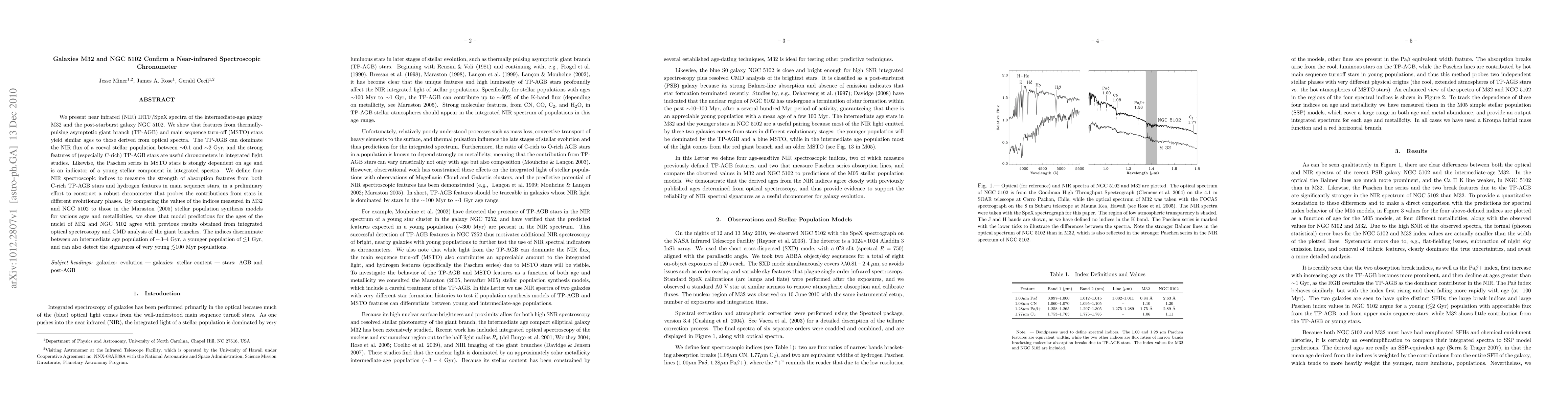This paper uses near-infrared spectra of galaxies M32 and NGC 5102 to validate a near-infrared spectroscopic chronometer based on features from thermally-pulsing AGB and main sequence turn-off stars. The study defines four NIR indices to measure absorption features, confirming their utility in determining stellar population ages and distinguishing between different evolutionary phases.