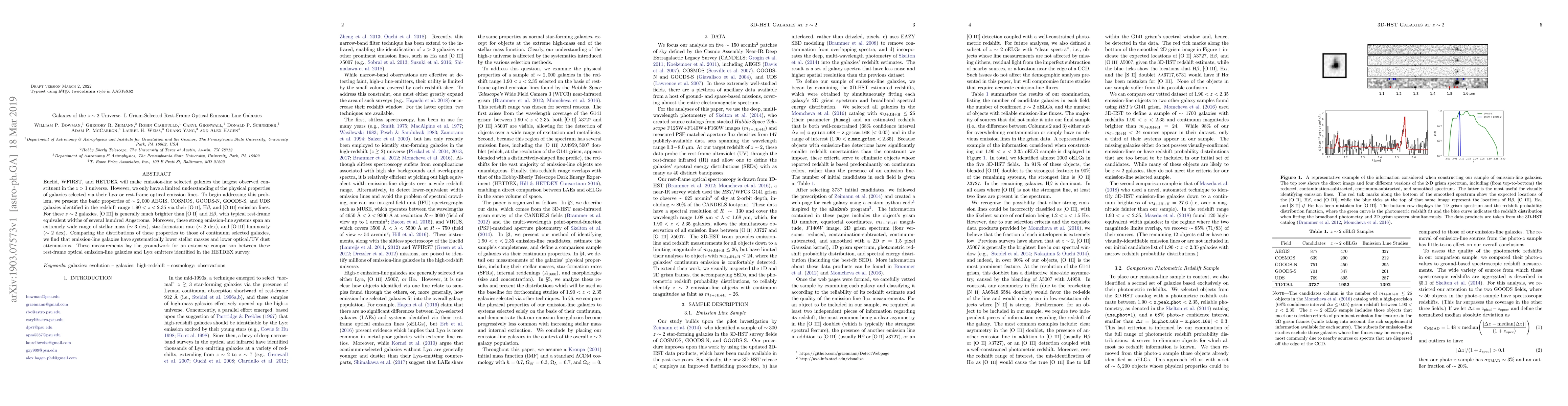 This paper investigates the properties of $\sim 2,000$ galaxies at $z \sim 2$ selected via their rest-frame optical emission lines, finding they span a wide range in stellar mass, star-formation rate, and [O III] luminosity. Emission-line galaxies exhibit lower stellar masses and lower dust attenuation compared to continuum-selected galaxies.