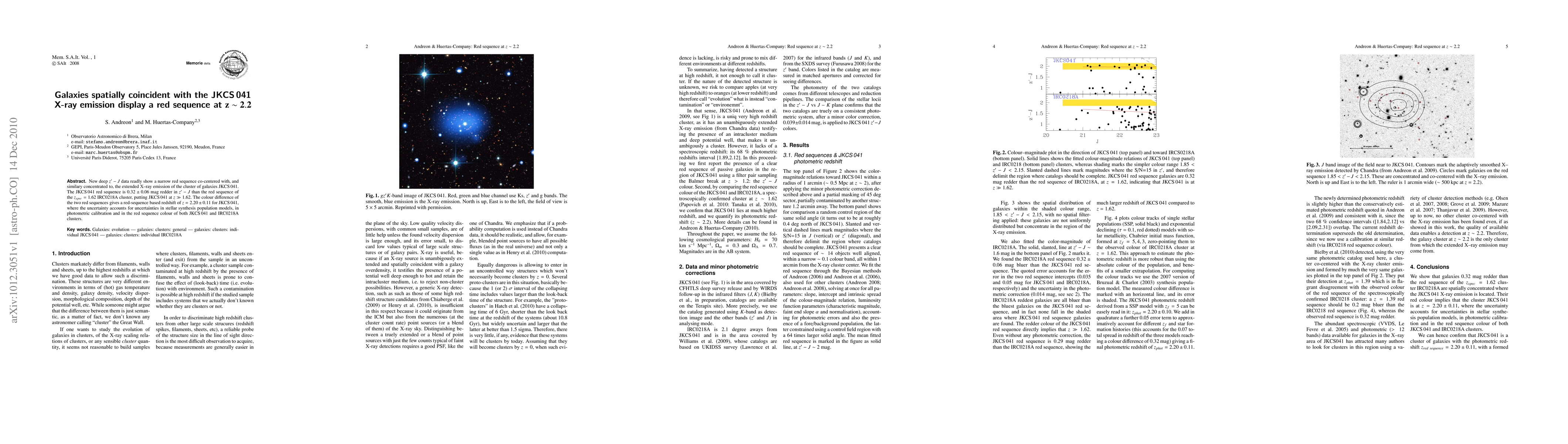New deep z'-J data readly show a narrow red sequence co-centered with, and similary concentrated to, the extended X-ray emission of the cluster of galaxies JKCS041. The JKCS041 red sequence is 0.32+/-0.06 mag redder in z'-J than the red sequence of the zspec=1.62 IRC0218A cluster, putting JKCS041 at z<<1.62. The colour difference of the two red sequences gives a red-sequence based redshift of z=2.20+/-0.11 for JKCS041, where the uncertainty accounts for uncertainties in stellar synthesis population models, in photometric calibration and in the red sequence colour of both JKCS041 and IRC0218A clusters.