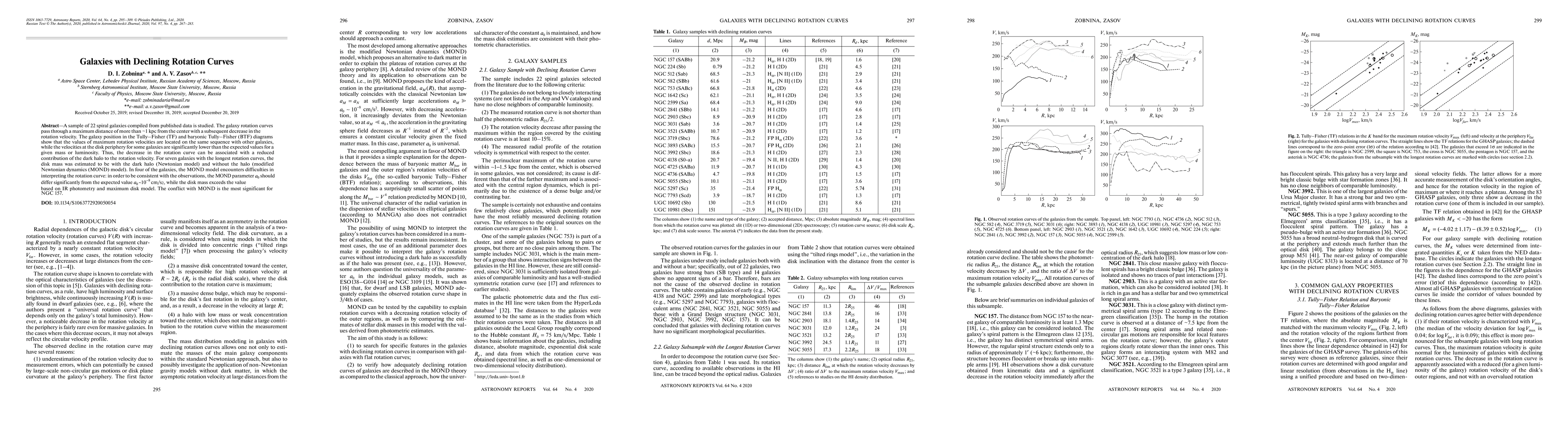 Research finds galaxies with declining rotation curves may indicate a reduced dark halo contribution to velocity, with some models (like MOND) struggling to explain the data, particularly in galaxy NGC 157.