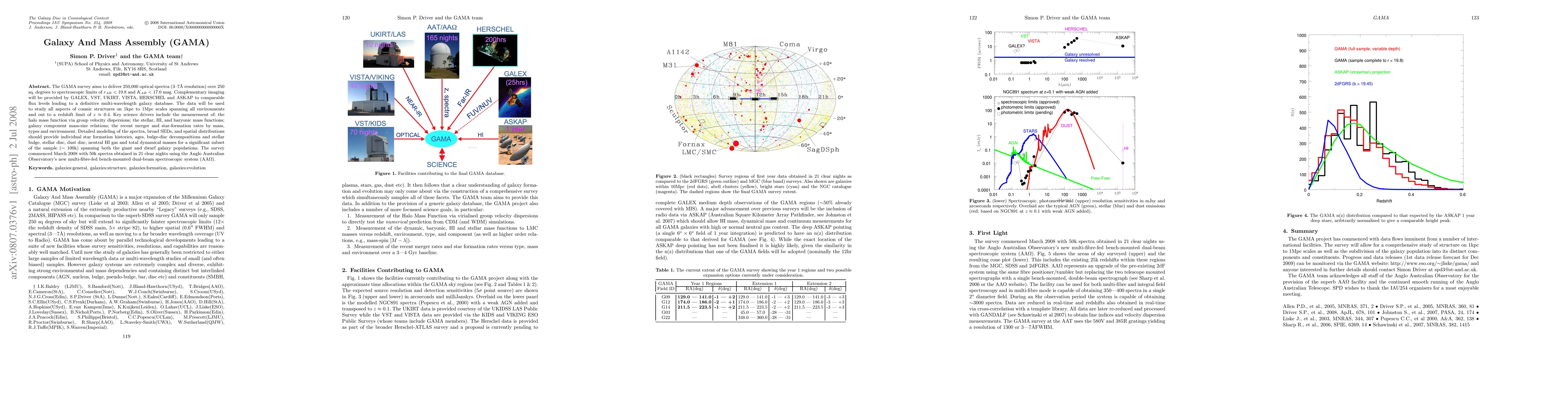 The GAMA survey aims to deliver 250,000 optical spectra (3--7Ang resolution) over 250 sq. degrees to spectroscopic limits of r_{AB} <19.8 and K_{AB}<17.0 mag. Complementary imaging will be provided by GALEX, VST, UKIRT, VISTA, HERSCHEL and ASKAP to comparable flux levels leading to a definitive multi-wavelength galaxy database. The data will be used to study all aspects of cosmic structures on 1kpc to 1Mpc scales spanning all environments and out to a redshift limit of z ~ 0.4. Key science drivers include the measurement of: the halo mass function via group velocity dispersions; the stellar, HI, and baryonic mass functions; galaxy component mass-size relations; the recent merger and star-formation rates by mass, types and environment. Detailed modeling of the spectra, broad SEDs, and spatial distributions should provide individual star formation histories, ages, bulge-disc decompositions and stellar bulge, stellar disc, dust disc, neutral HI gas and total dynamical masses for a significant subset of the sample (~100k) spanning both the giant and dwarf galaxy populations. The survey commenced March 2008 with 50k spectra obtained in 21 clear nights using the Anglo Australian Observatory's new multi-fibre-fed bench-mounted dual-beam spectroscopic system (AAOmega).