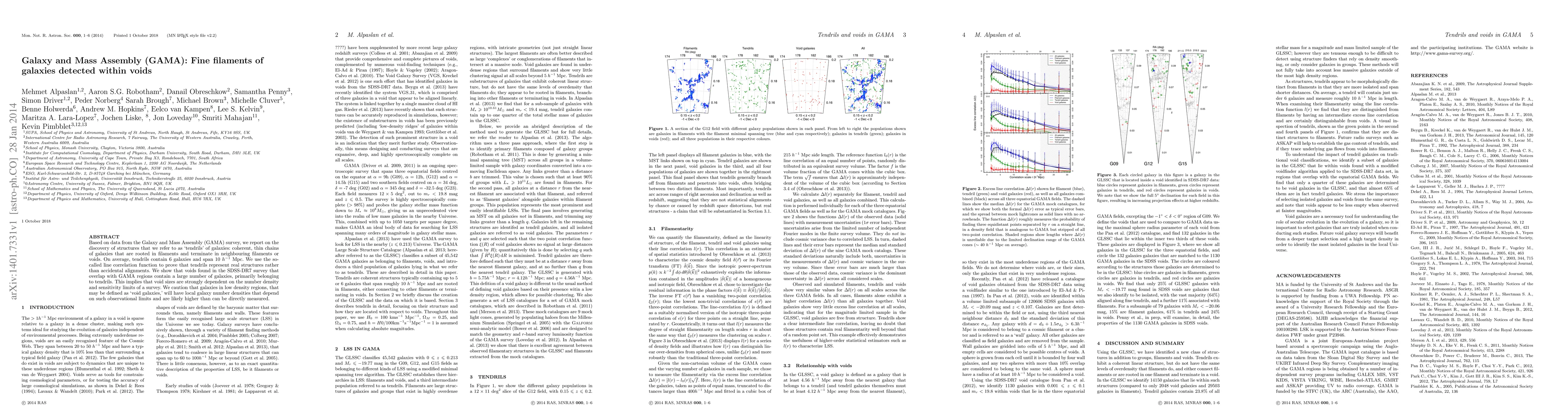 The GAMA survey reveals "tendrils" of galaxies—thin, coherent chains rooted in filaments and terminating in voids, containing on average 6 galaxies and spanning 10 $h^{-1}$ Mpc. These structures are confirmed as real using the line correlation function, indicating voids contain more galaxies than previously thought, primarily from these tendrils.