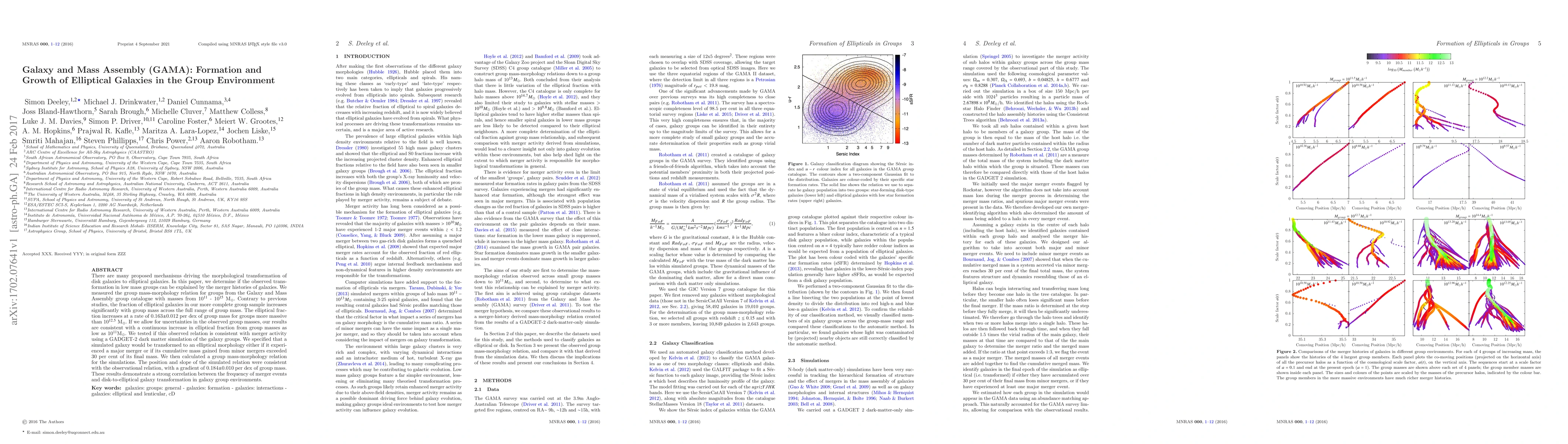There are many proposed mechanisms driving the morphological transformation of disk galaxies to elliptical galaxies. In this paper, we determine if the observed transformation in low mass groups can be explained by the merger histories of galaxies. We measured the group mass-morphology relation for groups from the Galaxy and Mass Assembly group catalogue with masses from 10$^{11}$ - 10$^{15}$ M$_{\odot}$. Contrary to previous studies, the fraction of elliptical galaxies in our more complete group sample increases significantly with group mass across the full range of group mass. The elliptical fraction increases at a rate of 0.163$\pm$0.012 per dex of group mass for groups more massive than 10$^{12.5}$ M$_{\odot}$. If we allow for uncertainties in the observed group masses, our results are consistent with a continuous increase in elliptical fraction from group masses as low as 10$^{11}$M$_{\odot}$. We tested if this observed relation is consistent with merger activity using a GADGET-2 dark matter simulation of the galaxy groups. We specified that a simulated galaxy would be transformed to an elliptical morphology either if it experienced a major merger or if its cumulative mass gained from minor mergers exceeded 30 per cent of its final mass. We then calculated a group mass-morphology relation for the simulations. The position and slope of the simulated relation were consistent with the observational relation, with a gradient of 0.184$\pm$0.010 per dex of group mass. These results demonstrate a strong correlation between the frequency of merger events and disk-to-elliptical galaxy transformation in galaxy group environments.