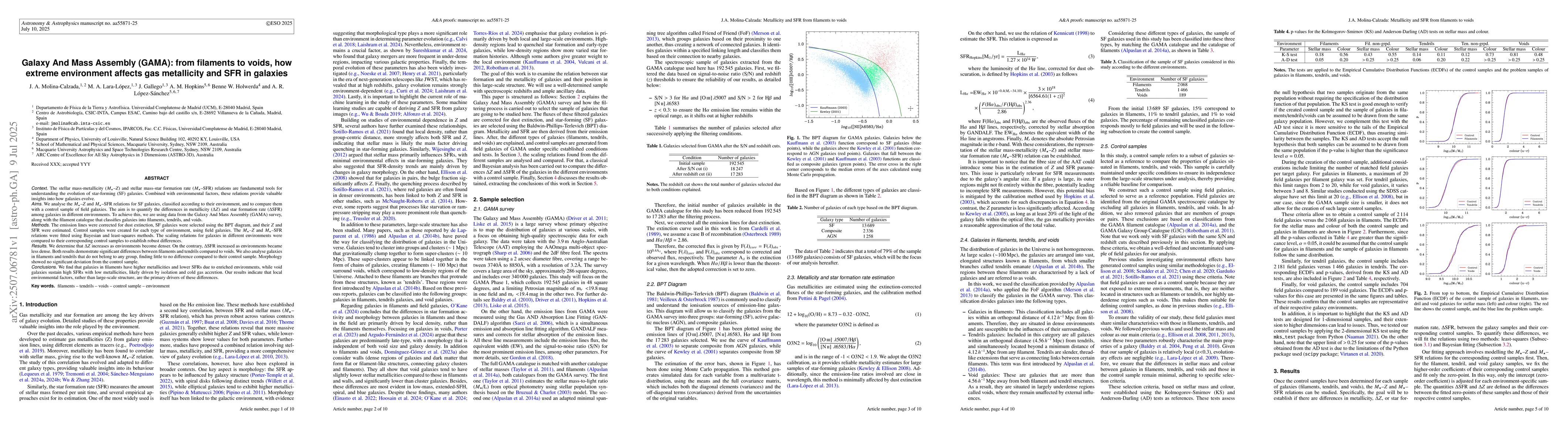 We analyse the stellar mass-metallicity (M-Z) and stellar mass-star formation rate (M-SFR) relations for star-forming galaxies classified by their environment and compare them with matched control samples of field galaxies. Using data from the Galaxy And Mass Assembly (GAMA) survey and the filament catalogue, which categorises galaxies into filaments, tendrils, and voids, we correct emission lines for dust extinction and select star-forming galaxies based on the BPT diagram. Metallicity and star formation rate are estimated and used to fit the M-Z and M-SFR relations through both Bayesian and least-squares approaches. We find that metallicity increases in denser environments, while star formation rate decreases, with the most notable contrasts seen between filament/tendril galaxies and those in voids. Galaxies in filaments and tendrils that are not group members show little to no deviation from their control samples. Morphological analysis reveals no significant differences. Overall, galaxies in denser environments appear more chemically enriched with lower SFRs, likely due to processed material and reduced cold gas availability, while isolated void galaxies maintain higher SFRs and lower metallicities, possibly due to ongoing cold gas accretion. These results suggest that local environmental conditions, rather than large-scale structure alone, are the main drivers of the observed trends.