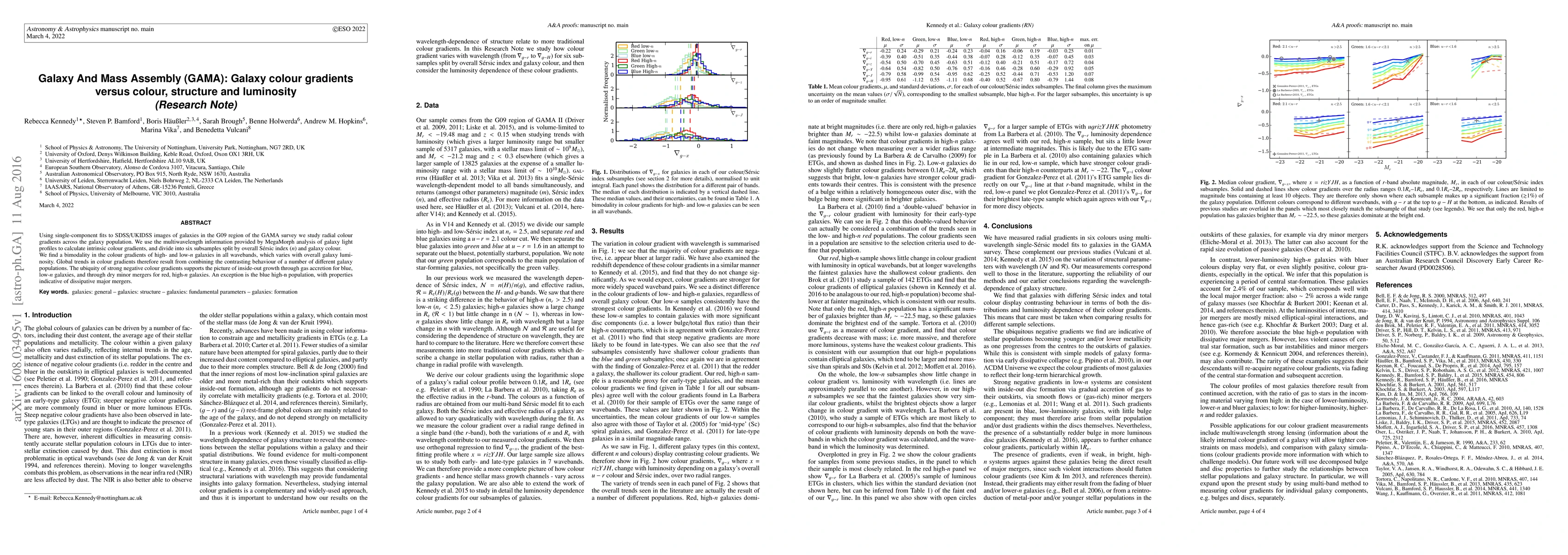 This paper investigates radial colour gradients in galaxies from the GAMA survey, finding a bimodality in gradients that correlates with galaxy structure and luminosity. The study supports an inside-out growth model for different galaxy populations, with notable exceptions like the blue high-$n$ galaxies, which suggest major mergers.