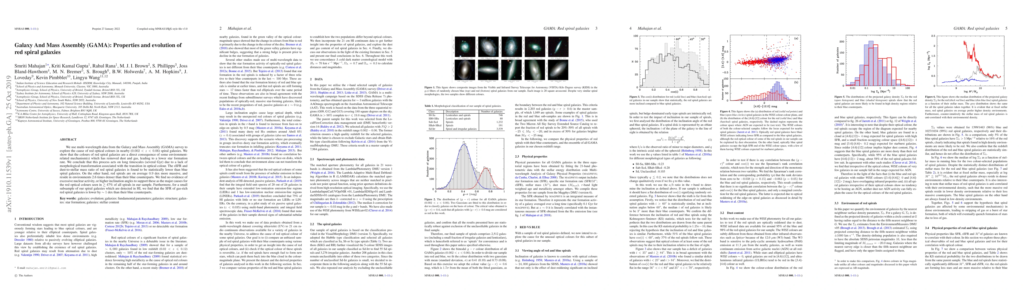 The GAMA survey reveals that red spiral galaxies exhibit lower star formation rates and dust-to-stellar mass ratios due to environmental mechanisms that strip away gas and dust, rather than morphological changes or nuclear activity. Red spirals are more massive and found in denser environments compared to blue spirals.