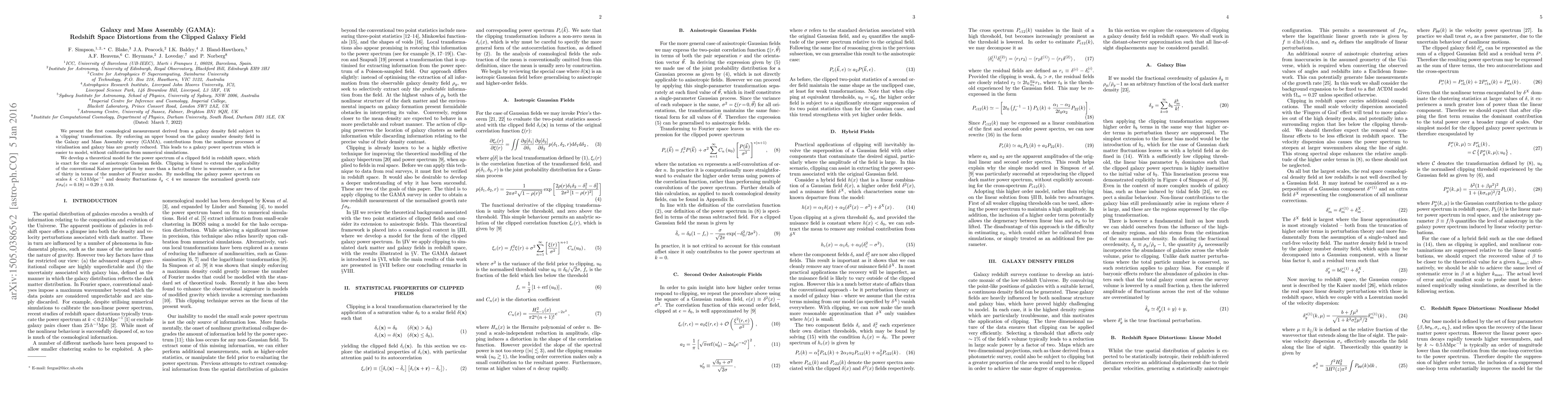 This paper measures cosmological parameters using the Galaxy and Mass Assembly (GAMA) survey's clipped galaxy density field, which reduces nonlinear effects. The study finds that clipping extends the Kaiser model's applicability and measures the normalised growth rate $f\sigma_8(z = 0.18) = 0.29 \pm 0.10$.