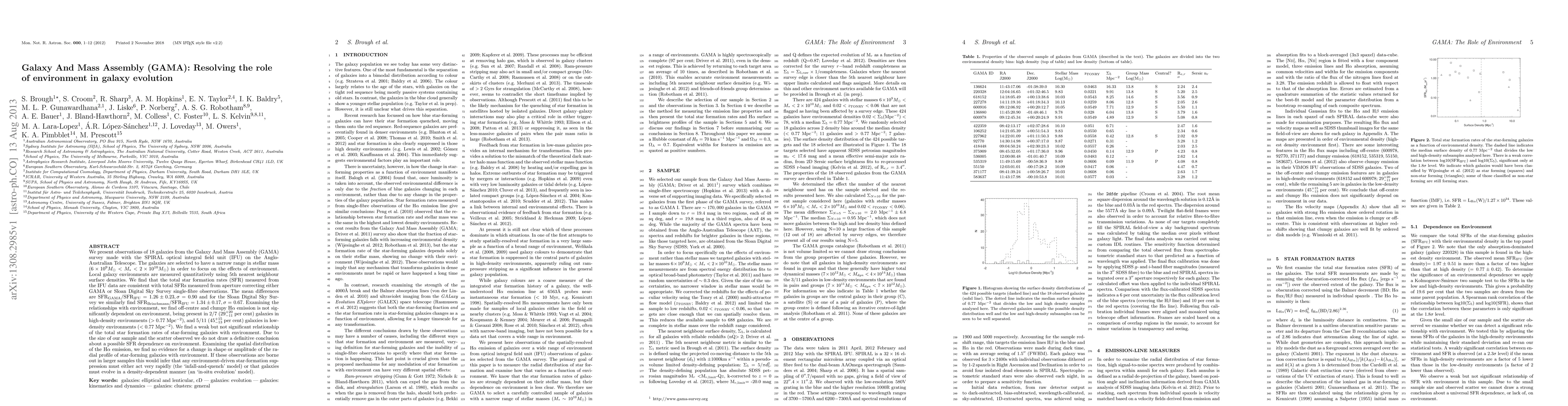The Galaxy And Mass Assembly (GAMA) study used SPIRAL IFU on the Anglo-Australian Telescope to observe 18 galaxies with similar mass. They found similar star formation rates (SFR) across different measurement methods and no significant link between off-center/clumpy Halpha emission and galaxy environment. The study suggests that environment-driven star-formation suppression, if existing, might operate quickly or through density-dependent in-situ evolution, lacking definitive evidence in this sample.