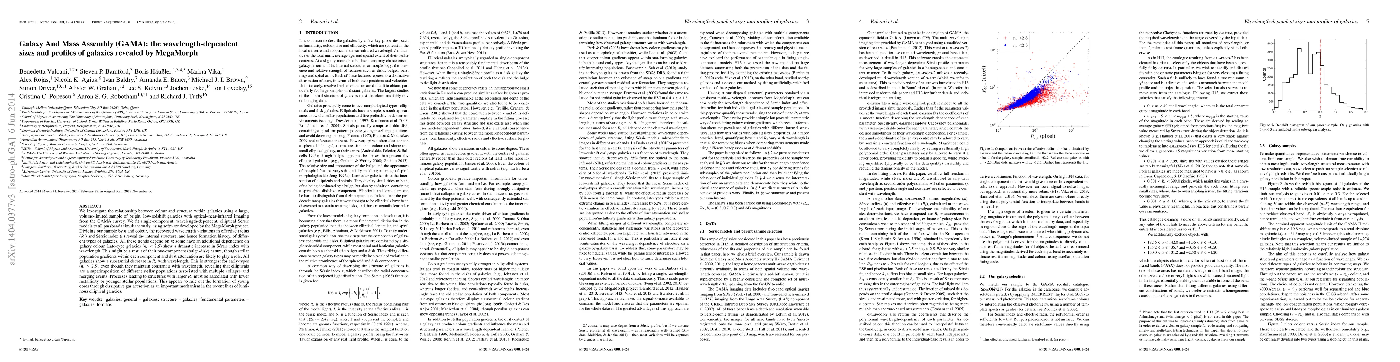 We investigate the relationship between colour and structure within galaxies using a large, volume-limited sample of bright, low-redshift galaxies with optical to near-infrared imaging from the GAMA survey. We fit single-component, wavelength-dependent, elliptical Sersic models to all passbands simultaneously, using software developed by the MegaMorph project. Dividing our sample by Sersic index and colour, the recovered wavelength variations in effective radius (R_e) and Sersic index (n) reveal the internal structure, and hence formation history, of different types of galaxies. All these trends depend on n; some have an additional dependence on galaxy colour. Late-type galaxies (n_r < 2.5) show a dramatic increase in Sersic index with wavelength. This might be a result of their two-component (bulge-disk) nature, though stellar population gradients within each component and dust attenuation are likely to play a role. All galaxies show a substantial decrease in R_e with wavelength. This is strongest for early-types (n_r > 2.5), even though they maintain constant n with wavelength, revealing that ellipticals are a superimposition of different stellar populations associated with multiple collapse and merging events. Processes leading to structures with larger R_e must be associated with lower metallicity or younger stellar populations. This appears to rule out the formation of young cores through dissipative gas accretion as an important mechanism in the recent lives of luminous elliptical galaxies.