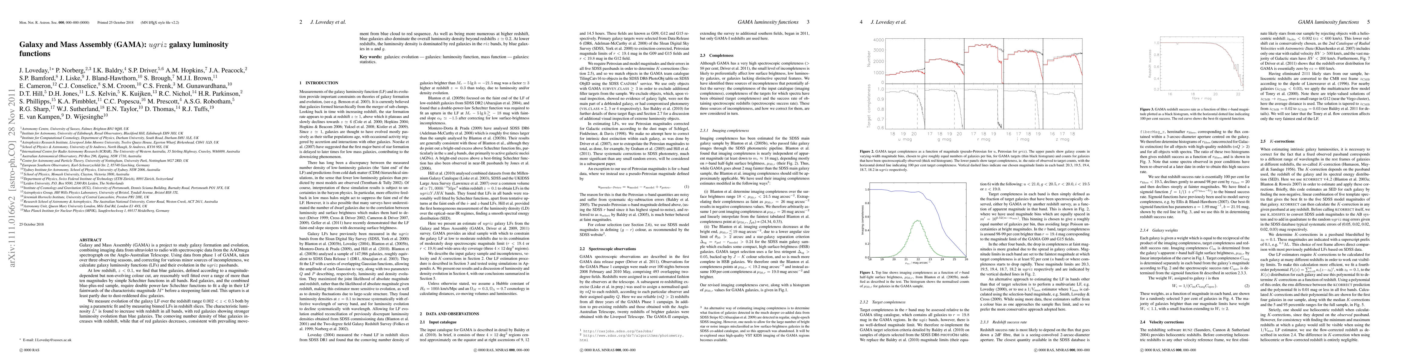 The GAMA project provides luminosity functions for galaxies in the ugriz bands, revealing that blue galaxies follow simple Schechter functions while red galaxies require double power-law fits. The luminosity density evolves with redshift, showing stronger luminosity growth in red galaxies and a shift from red to blue galaxy dominance at higher redshifts.