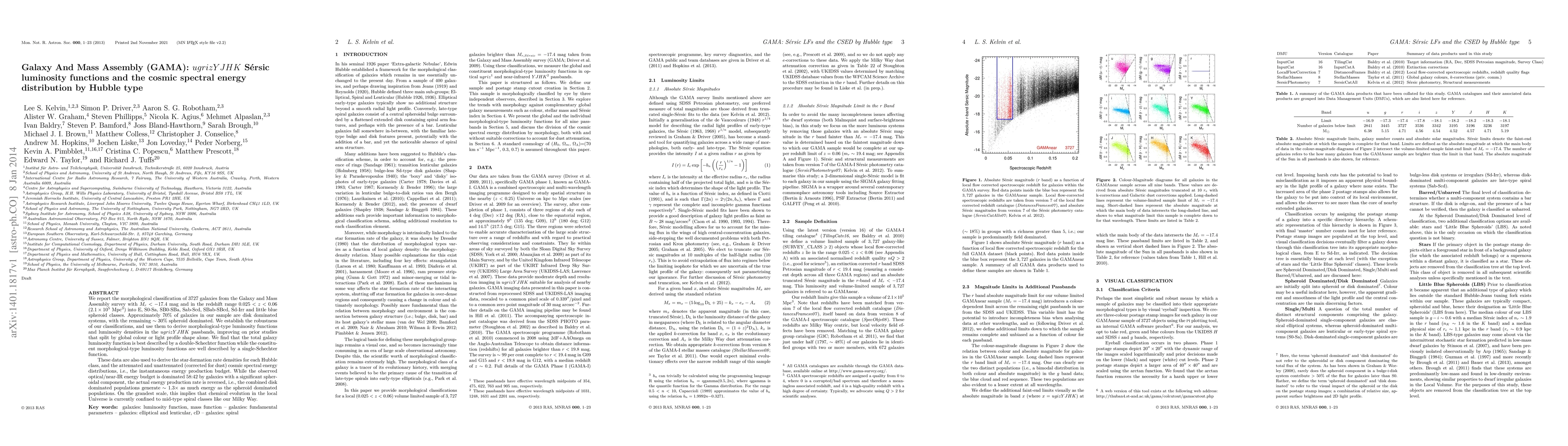 We report the morphological classification of 3727 galaxies from the Galaxy and Mass Assembly survey with M_r < -17.4 mag and in the redshift range 0.025 < z < 0.06 (2.1 x 10^5 Mpc^3 ) into E, S0-Sa, SB0-SBa, Sab-Scd, SBab-SBcd, Sd-Irr and little blue spheroid classes. Approximately 70% of galaxies in our sample are disk dominated systems, with the remaining ~30% spheroid dominated. We establish the robustness of our classifications, and use them to derive morphological-type luminosity functions and luminosity densities in the ugrizYJHK passbands, improving on prior studies that split by global colour or light profile shape alone. We find that the total galaxy luminosity function is best described by a double-Schechter function while the constituent morphological-type luminosity functions are well described by a single-Schechter function. These data are also used to derive the star-formation rate densities for each Hubble class, and the attenuated and unattenuated (corrected for dust) cosmic spectral energy distributions, i.e., the instantaneous energy production budget. While the observed optical/near-IR energy budget is dominated 58:42 by galaxies with a significant spheroidal component, the actual energy production rate is reversed, i.e., the combined disk dominated populations generate ~1.3x as much energy as the spheroid dominated populations. On the grandest scale, this implies that chemical evolution in the local Universe is currently confined to mid-type spiral classes like our Milky Way.
