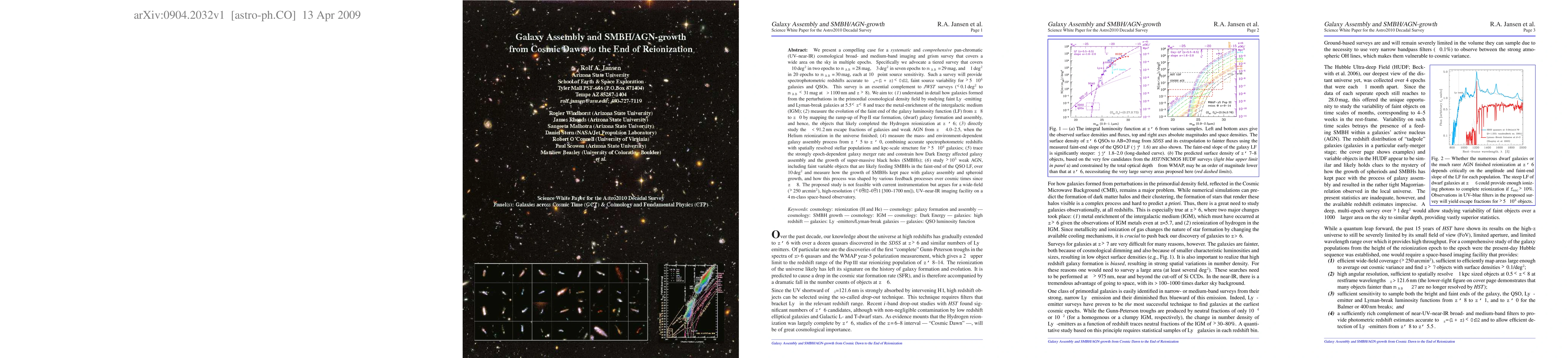 This research proposes a comprehensive survey to study galaxy formation and the growth of supermassive black holes (SMBHs) from cosmic dawn to reionization. The survey aims to trace the evolution of galaxies, star formation, and the reionization processes, using a wide-field, high-resolution UV-near-IR imaging facility on a space observatory.