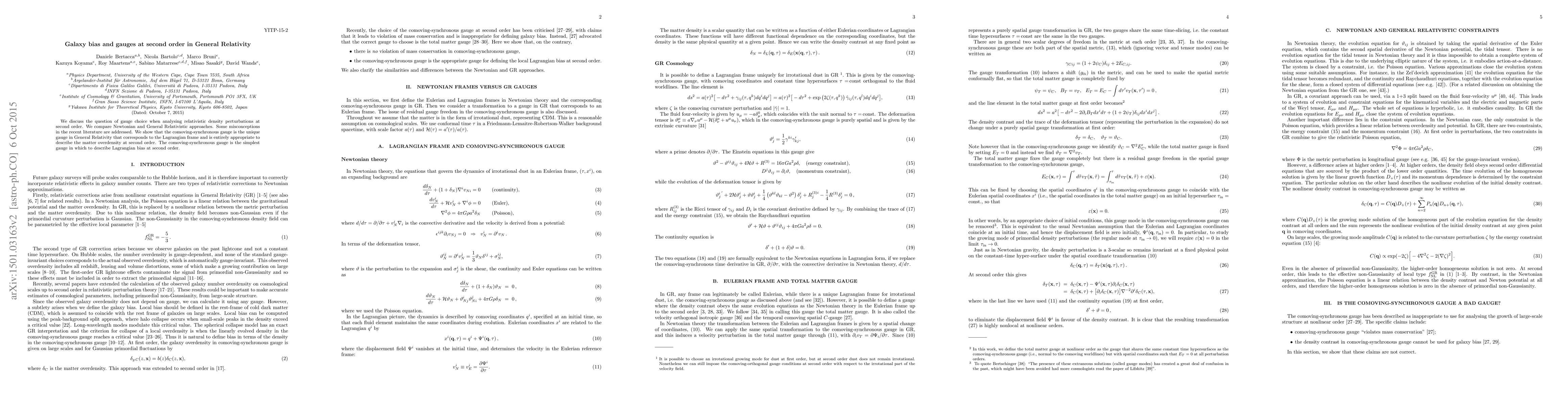 We discuss the question of gauge choice when analysing relativistic density perturbations at second order. We compare Newtonian and General Relativistic approaches. Some misconceptions in the recent literature are addressed. We show that the comoving-synchronous gauge is the unique gauge in General Relativity that corresponds to the Lagrangian frame and is entirely appropriate to describe the matter overdensity at second order. The comoving-synchronous gauge is the simplest gauge in which to describe Lagrangian bias at second order.