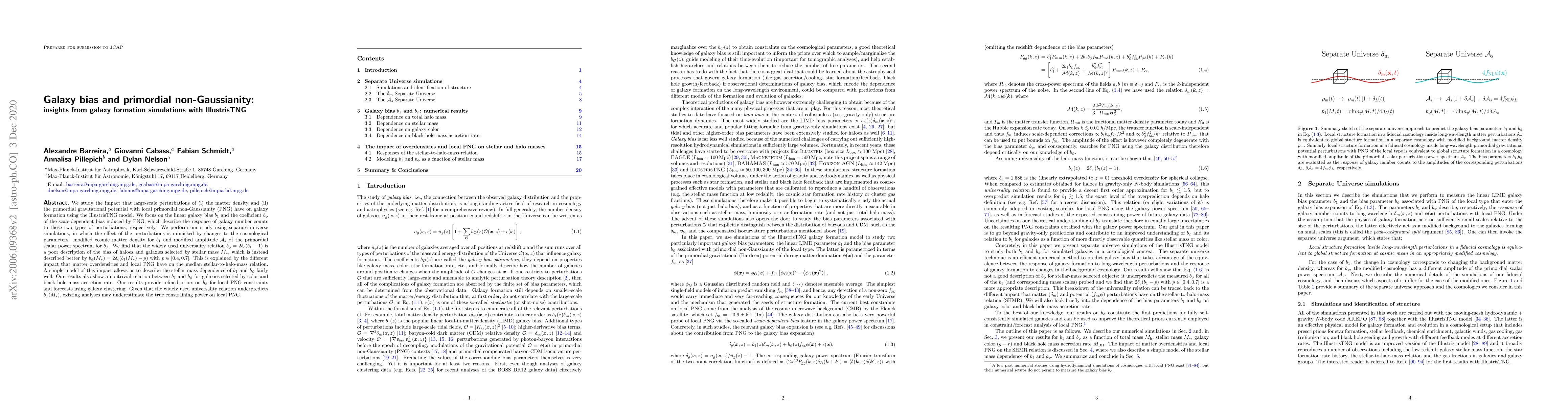We study the impact that large-scale perturbations of (i) the matter density and (ii) the primordial gravitational potential with local primordial non-Gaussianity (PNG) have on galaxy formation using the IllustrisTNG model. We focus on the linear galaxy bias $b_1$ and the coefficient $b_\phi$ of the scale-dependent bias induced by PNG, which describe the response of galaxy number counts to these two types of perturbations, respectively. We perform our study using separate universe simulations, in which the effect of the perturbations is mimicked by changes to the cosmological parameters: modified cosmic matter density for $b_1$ and modified amplitude $\mathcal{A}_s$ of the primordial scalar power spectrum for $b_\phi$. We find that the widely used universality relation $b_\phi = 2\delta_c(b_1 - 1)$ is a poor description of the bias of haloes and galaxies selected by stellar mass $M_*$, which is instead described better by $b_\phi(M_*) = 2\delta_c(b_1(M_*) - p)$ with $p \in [0.4, 0.7]$. This is explained by the different impact that matter overdensities and local PNG have on the median stellar-to-halo-mass relation. A simple model of this impact allows us to describe the stellar mass dependence of $b_1$ and $b_\phi$ fairly well. Our results also show a nontrivial relation between $b_1$ and $b_\phi$ for galaxies selected by color and black hole mass accretion rate. Our results provide refined priors on $b_\phi$ for local PNG constraints and forecasts using galaxy clustering. Given that the widely used universality relation underpredicts $b_\phi(M_*)$, existing analyses may underestimate the true constraining power on local PNG.