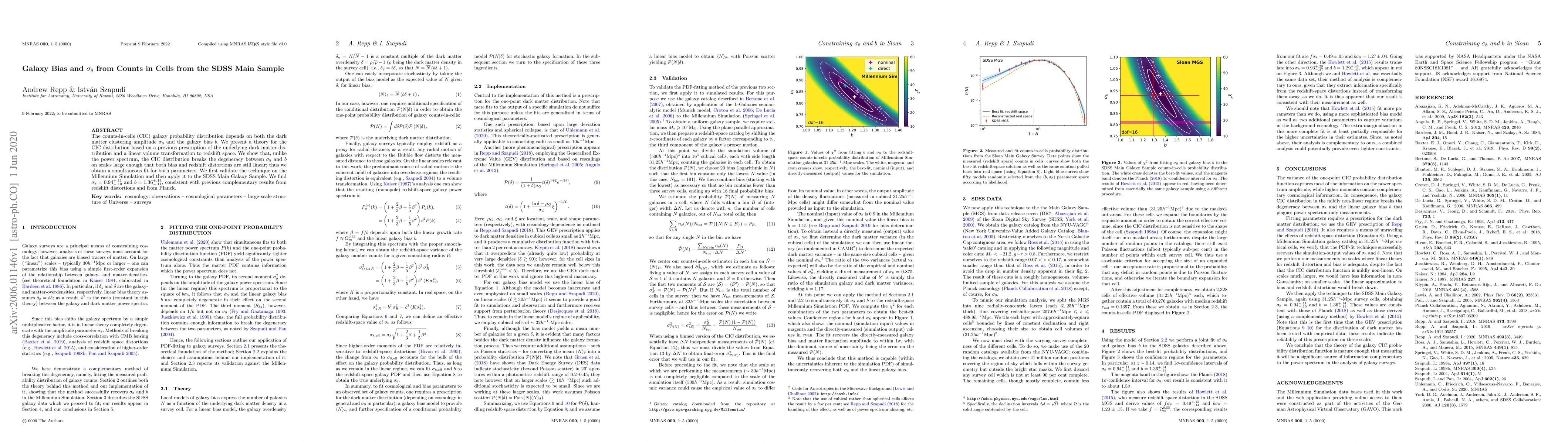 This paper develops a theory for the counts-in-cells galaxy distribution to simultaneously determine $\sigma_8$ and galaxy bias $b$. It validates the method using the Millennium Simulation and applies it to the SDSS Main Galaxy Sample, finding $\sigma_8 = 0.94$ and $b = 1.36$.