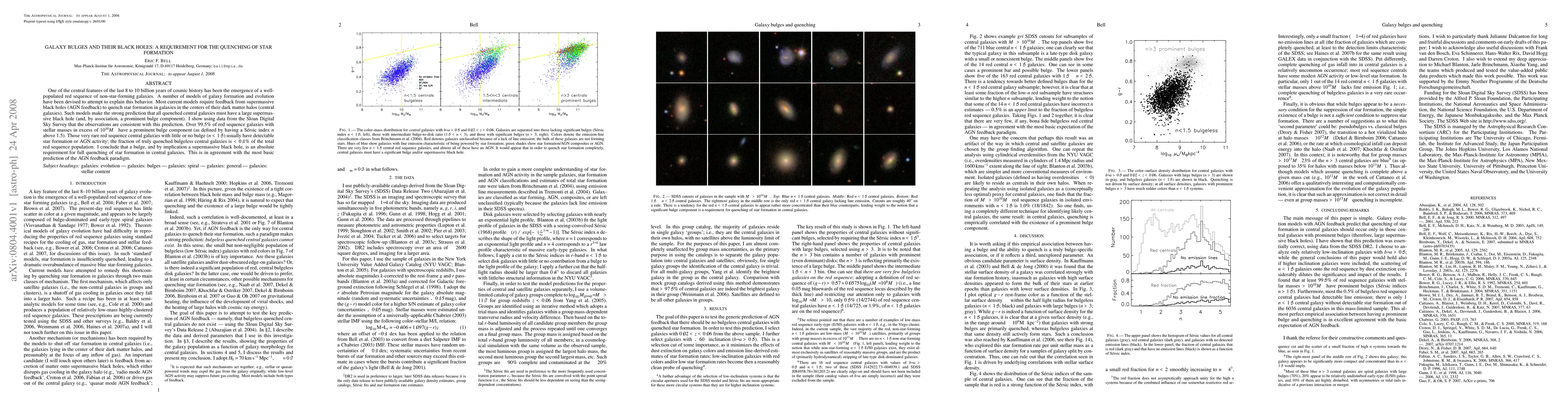 The paper finds that galaxies with prominent bulges and supermassive black holes are essential for quenching star formation in central galaxies, supporting the AGN feedback model. Observations from the Sloan Digital Sky Survey show that nearly all massive red sequence galaxies have a large bulge, indicating a strong correlation between bulge presence and star formation quenching.