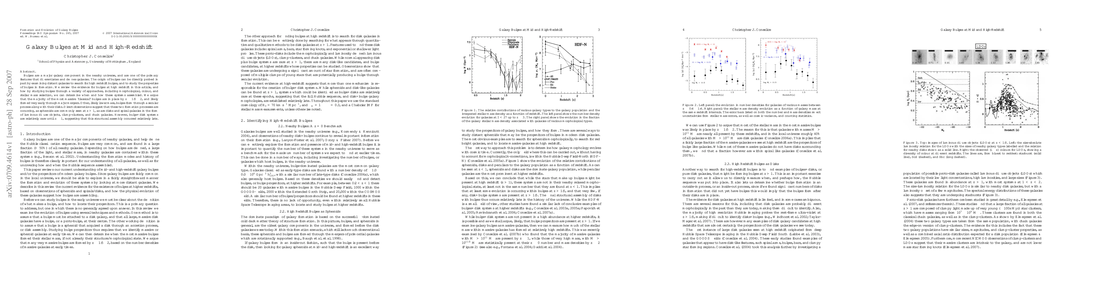 This paper reviews evidence for the formation and evolution of galaxy bulges at high redshifts, finding that massive 'classical' bulges formed early via major mergers, while smaller bulges develop later through secular processes. Observations show that while spheroids and disks are common at z > 1, complete bulge+disk systems are rare until around z ~ 1, indicating a later structural assembly.