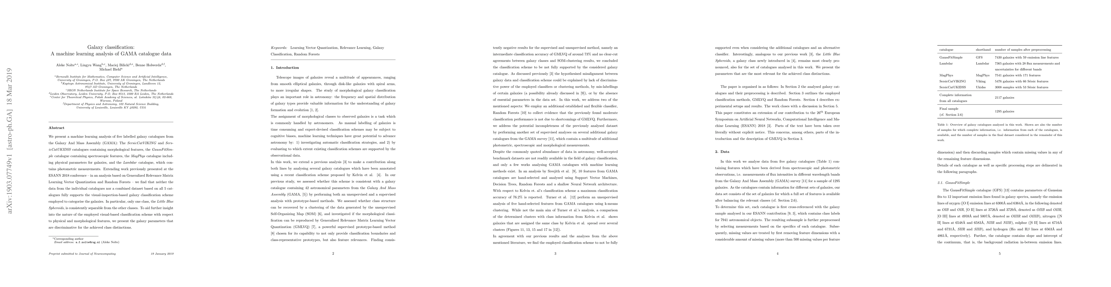 We present a machine learning analysis of five labelled galaxy catalogues from the Galaxy And Mass Assembly (GAMA): The SersicCatVIKING and SersicCatUKIDSS catalogues containing morphological features, the GaussFitSimple catalogue containing spectroscopic features, the MagPhys catalogue including physical parameters for galaxies, and the Lambdar catalogue, which contains photometric measurements. Extending work previously presented at the ESANN 2018 conference - in an analysis based on Generalized Relevance Matrix Learning Vector Quantization and Random Forests - we find that neither the data from the individual catalogues nor a combined dataset based on all 5 catalogues fully supports the visual-inspection-based galaxy classification scheme employed to categorise the galaxies. In particular, only one class, the Little Blue Spheroids, is consistently separable from the other classes. To aid further insight into the nature of the employed visual-based classification scheme with respect to physical and morphological features, we present the galaxy parameters that are discriminative for the achieved class distinctions.