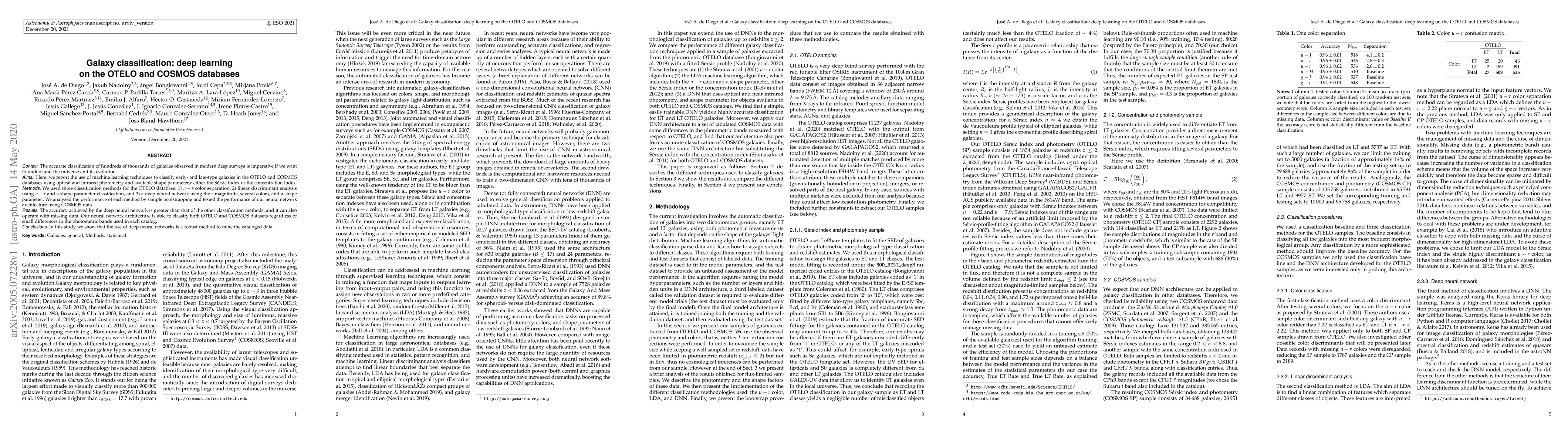 Context. The accurate classification of hundreds of thousands of galaxies observed in modern deep surveys is imperative if we want to understand the universe and its evolution. Aims. Here, we report the use of machine learning techniques to classify early- and late-type galaxies in the OTELO and COSMOS databases using optical and infrared photometry and available shape parameters: either the Sersic index or the concentration index. Methods. We used three classification methods for the OTELO database: 1) u-r color separation , 2) linear discriminant analysis using u-r and a shape parameter classification, and 3) a deep neural network using the r magnitude, several colors, and a shape parameter. We analyzed the performance of each method by sample bootstrapping and tested the performance of our neural network architecture using COSMOS data. Results. The accuracy achieved by the deep neural network is greater than that of the other classification methods, and it can also operate with missing data. Our neural network architecture is able to classify both OTELO and COSMOS datasets regardless of small differences in the photometric bands used in each catalog. Conclusions. In this study we show that the use of deep neural networks is a robust method to mine the cataloged data